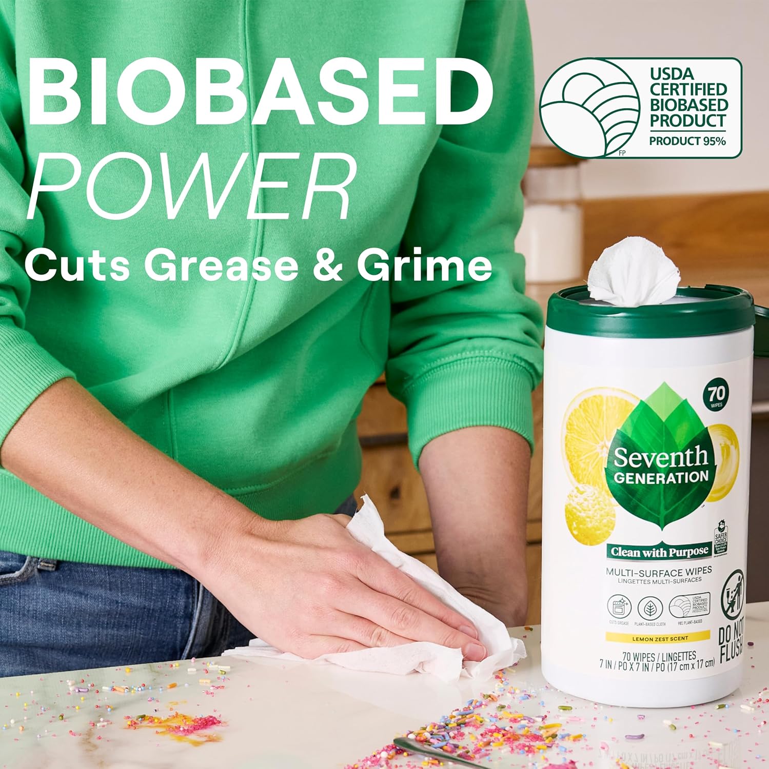 - Seventh Generation multi purpose cleaner wipes that work on most home surfaces