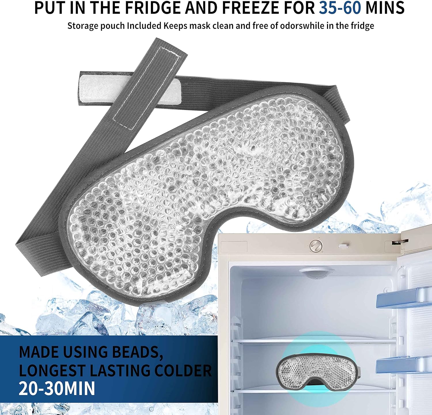 - RELIEVE DISCOMFORT: The gel bead eye mask is a quick and easy way to relieve your eye discomfort. Freezing the cooling gel eye mask and put it on your eyes to reduce puffiness from a night of poor sleep or a late night, or to relieve tired eyes that have been staring at a computer all-day