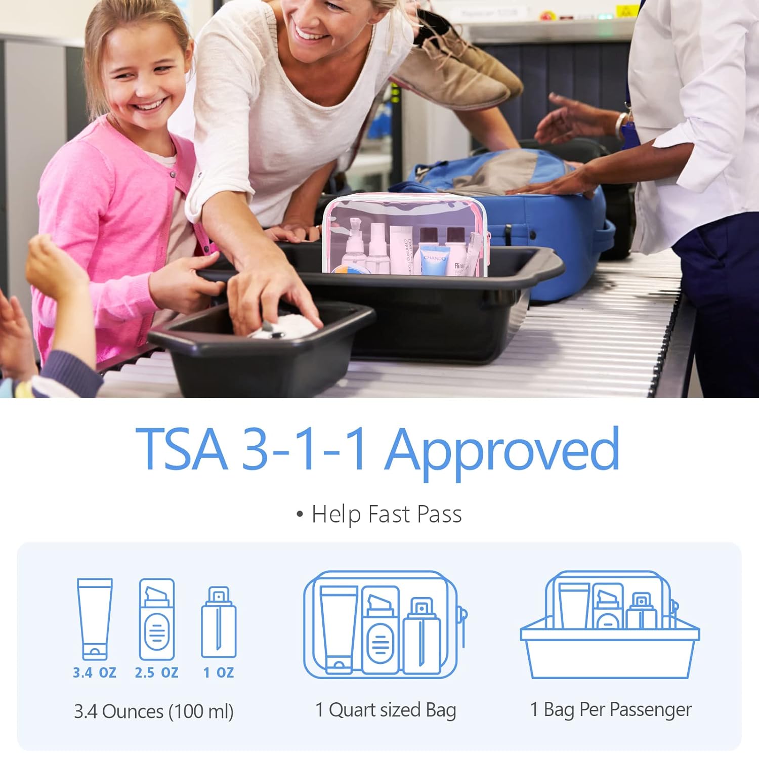 - 【TSA Approved】Fly stress-free with this 7.5 x 5.5 x 2.2 inch (19 x 14 x 5.5 cm) tsa approved toiletry bag that meets all airline 3-1-1 liquid rules; Speed through security checks without unpacking thanks to the compliant transparent design