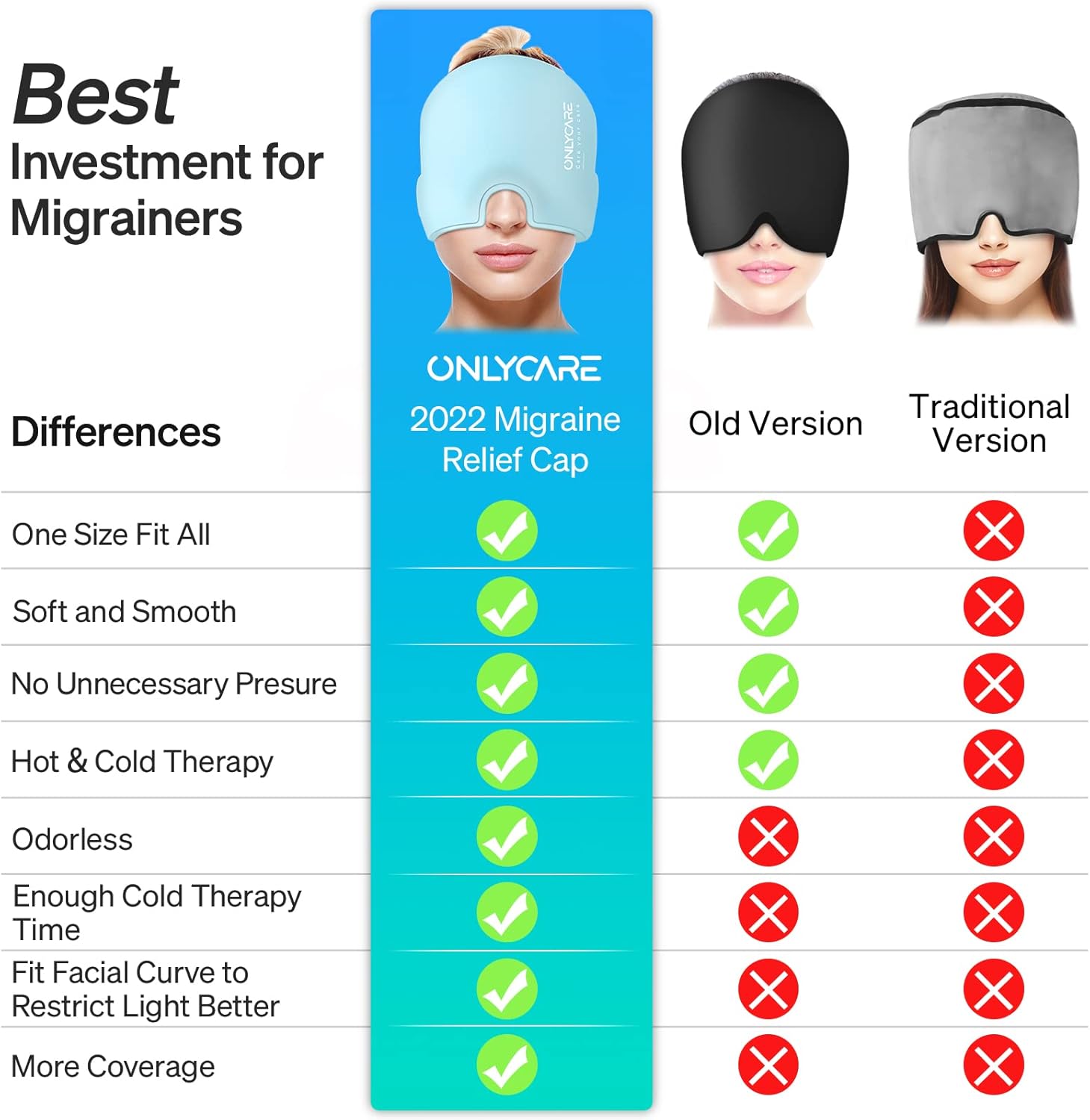 ONLYCARE Migraine Relief Cap, Upgraded Odorless Migraine Ice Head Wrap, Headache Relief Hat for Migraine, Blue
