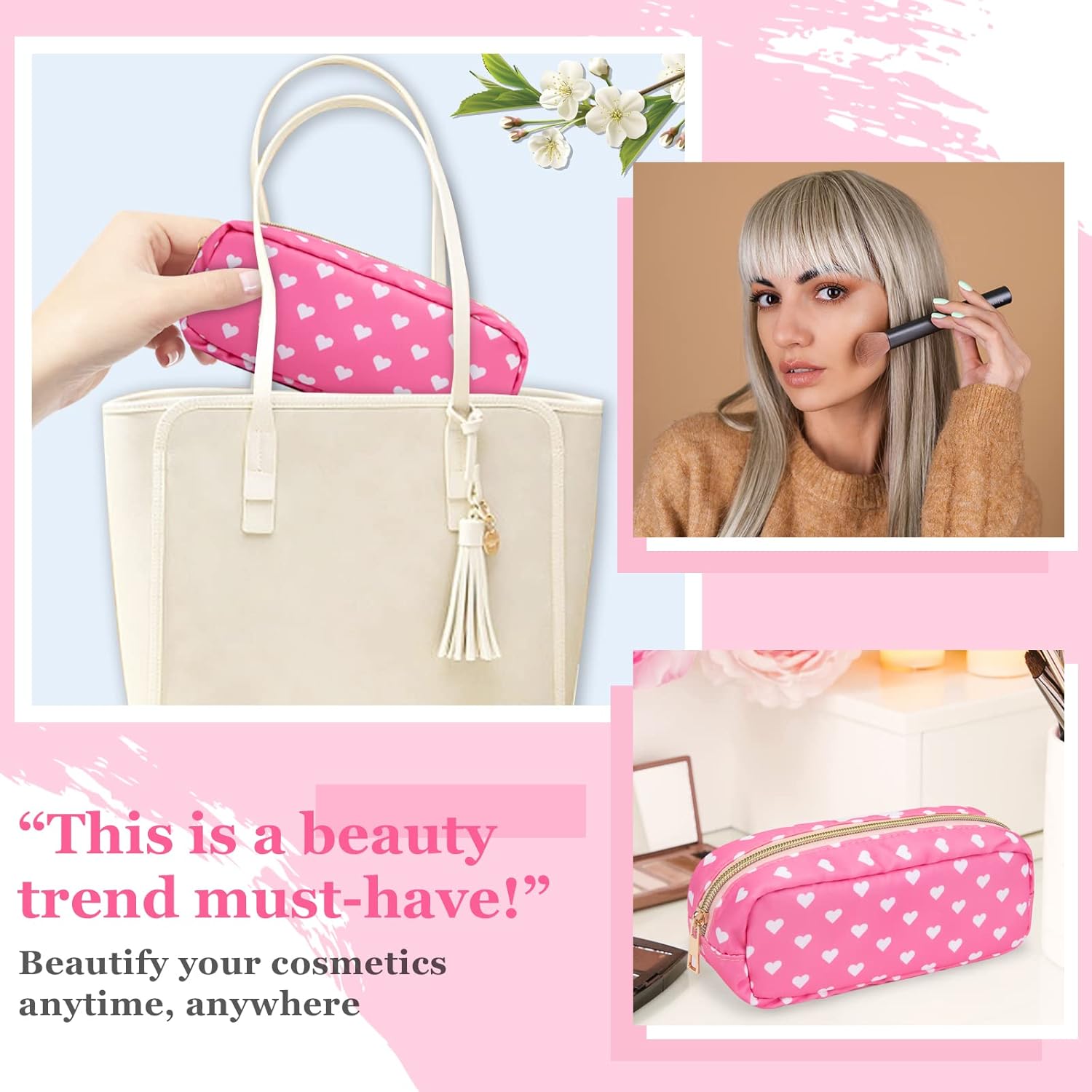 - ❤【Multiple Sizes & Colors】Large, Small, Mini, or Slim, we have it all! Cosmetic bag has a variety of patterns to choose from: pink hearts, black houndstooth, black and white grids, pink and blue grids for you to choose. Nylon makeup bag for purse can be used for travel, outdoors and organization, it can be used as a purse bag, travel pouch and more.
