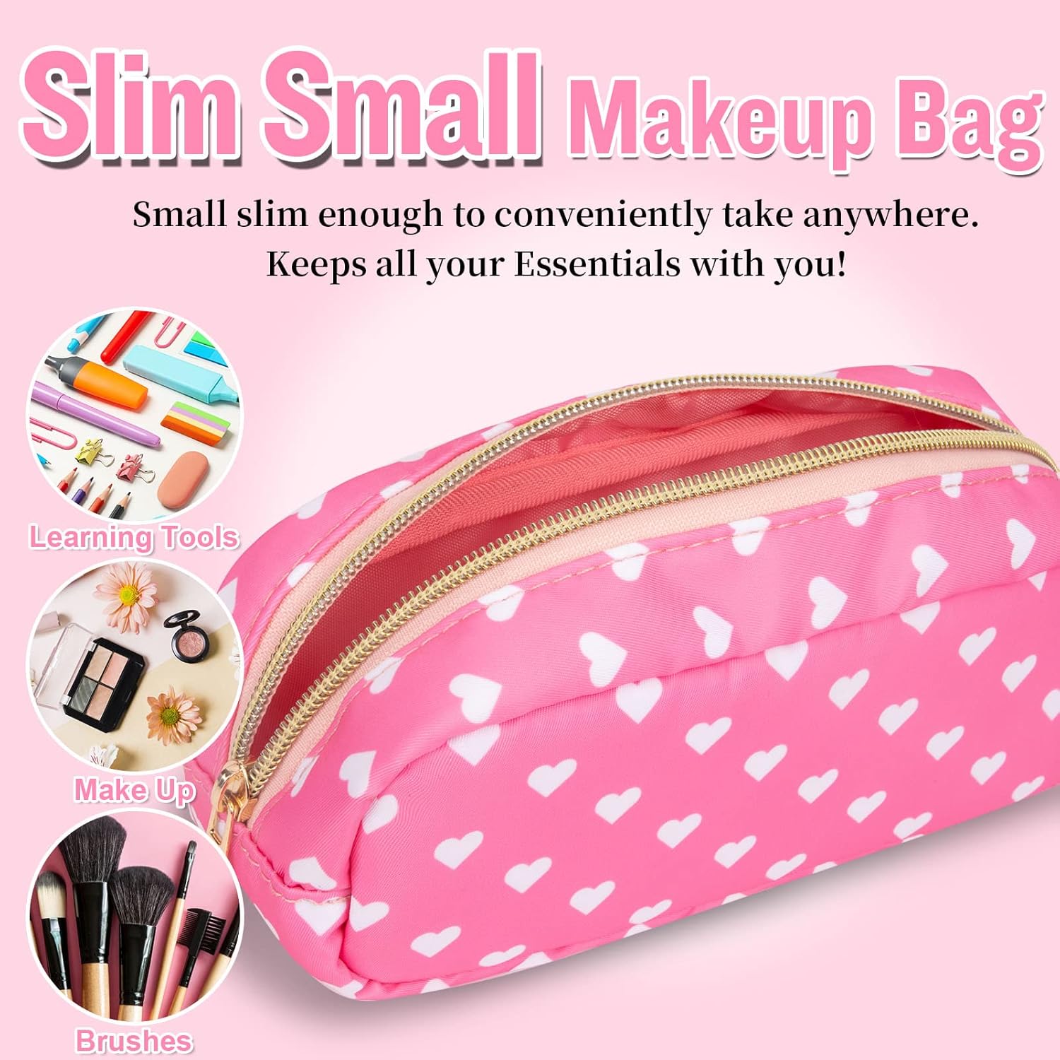 Nylon Slim Makeup Bag, Pink Heart Makeup Brush Case, Preppy Cosmetic Zipper Pouch for Purse, Travel Toiletry Bag Clutch Coin Pouch Makeup Organizer for Women Girls