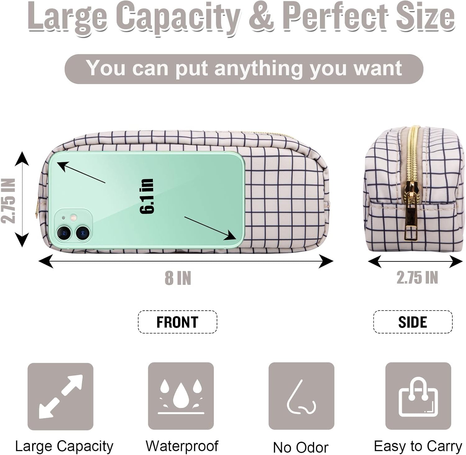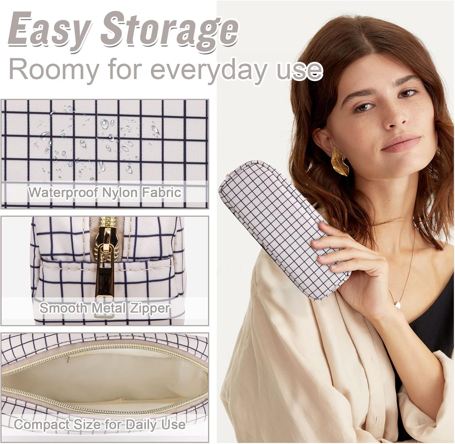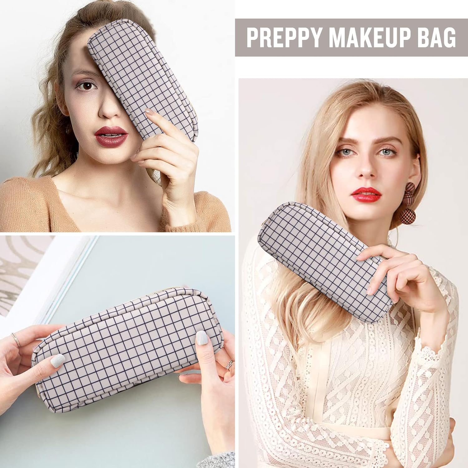 - ❤【Multiple Sizes & Colors】Large, Small, Mini, or Slim, we have it all! Cosmetic bag has a variety of patterns to choose from: pink hearts, black houndstooth, black and white grids, pink and blue grids for you to choose. Nylon makeup bag for purse can be used for travel, outdoors and organization, it can be used as a purse bag, travel pouch and more.