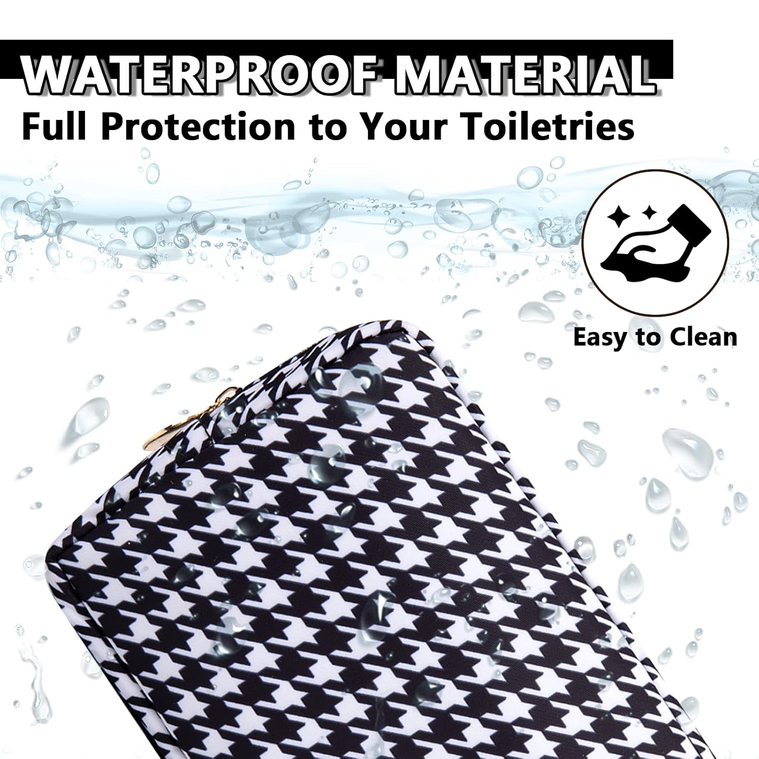 - 【Multiple Options】The waterproof makeup bag has four sizes, Mini(4.75''*2''*5''), Small(9.5''*2''*5''), Large(11''*5''*8'') and Slim(2.75*8''*2.75''). You can choose the right size according to the items you want to store. We have four types of patterns, Pink Heart, Houndstooth, Checkerboard grid and White Heart. You can enjoy choosing the pattern you like.