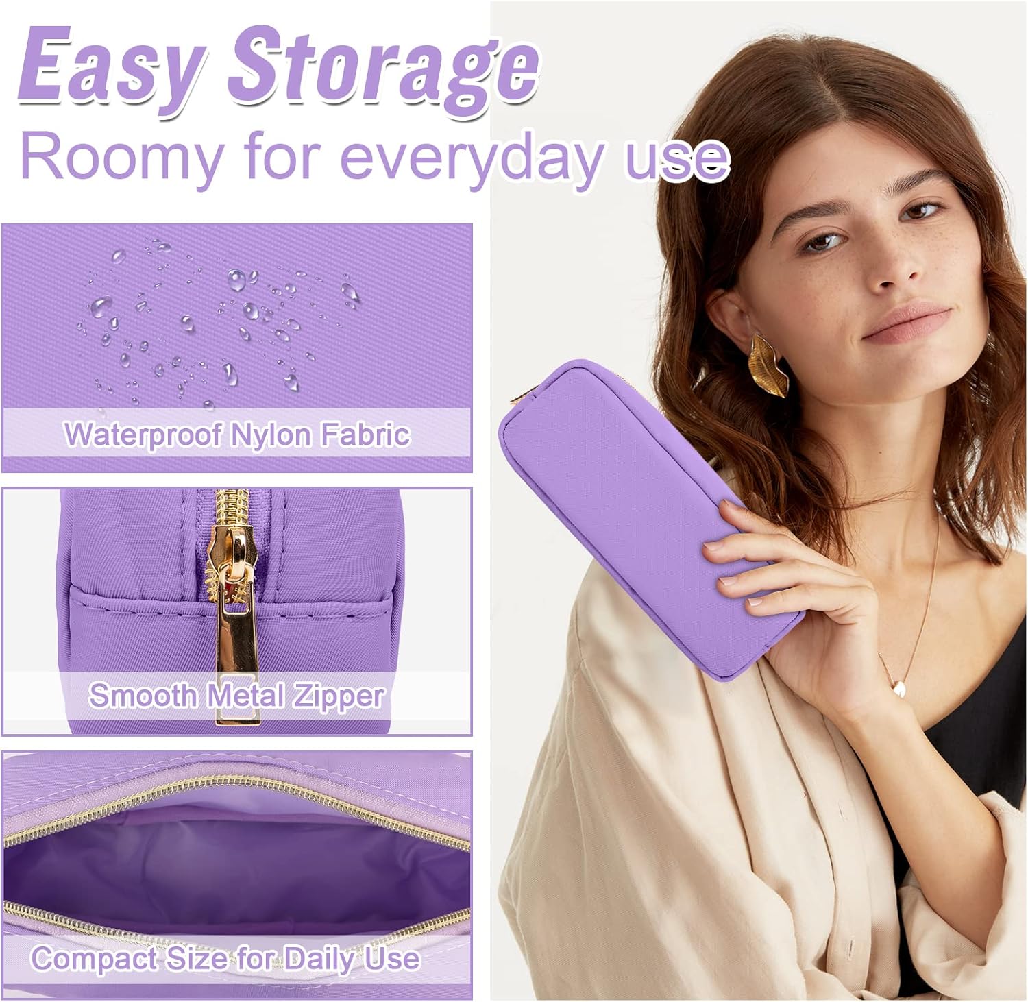 - ❤【DIY Your Bag & Patches Friendly】Slim compact makeup bag material allows you to easily attach your favorite patches and fits all travel toiletries. You can put any chenille letters or patterns you want on it, "STUFF" SNACK "BEACH" and so on to design your unique travel makeup bag. Make your preppy makeup bag very interesting and vivid!