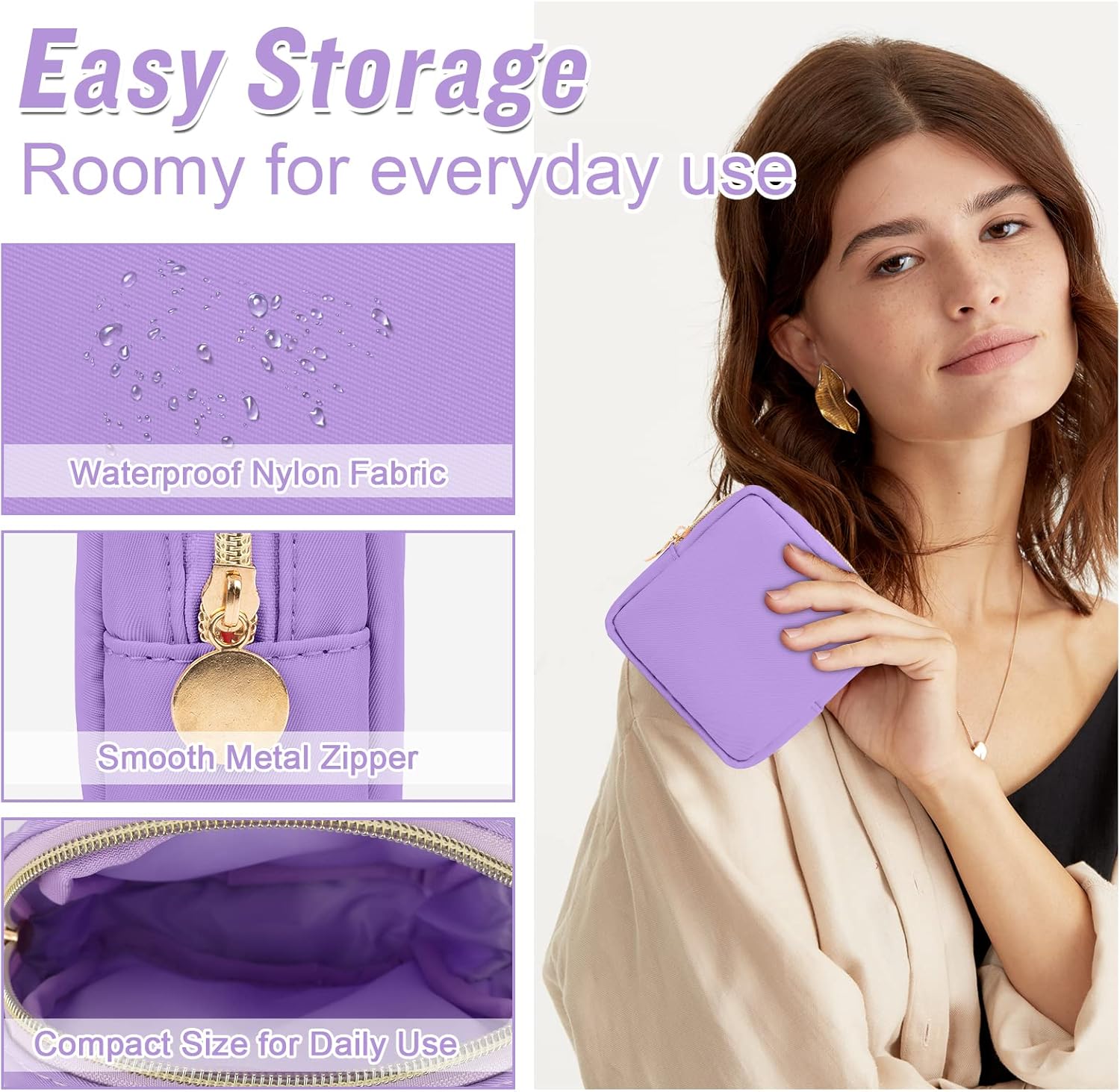 Nylon Mini Makeup Bag for Purse, Preppy Small Cute Makeup Bag Cosmetic Zipper Pouch Purse, Waterproof Travel Coin Pouch Sanitary Napkin Storage Bag Clutch Makeup Organizer for Women Men Girls(Purple)