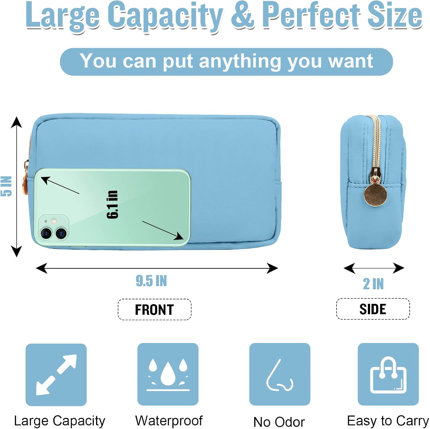 - ❤【Large Capacity & Perfect Size】Small Makeup Bag Size is 9.5*5*2inch/24*12.7*5cm, the large capacity storage bag can store all your cosmetics, snacks, phone, purse, sunglasses, travel essentials and anything you need. The easy and large opening design makes it easy to take. Keep your contents separate and organized.