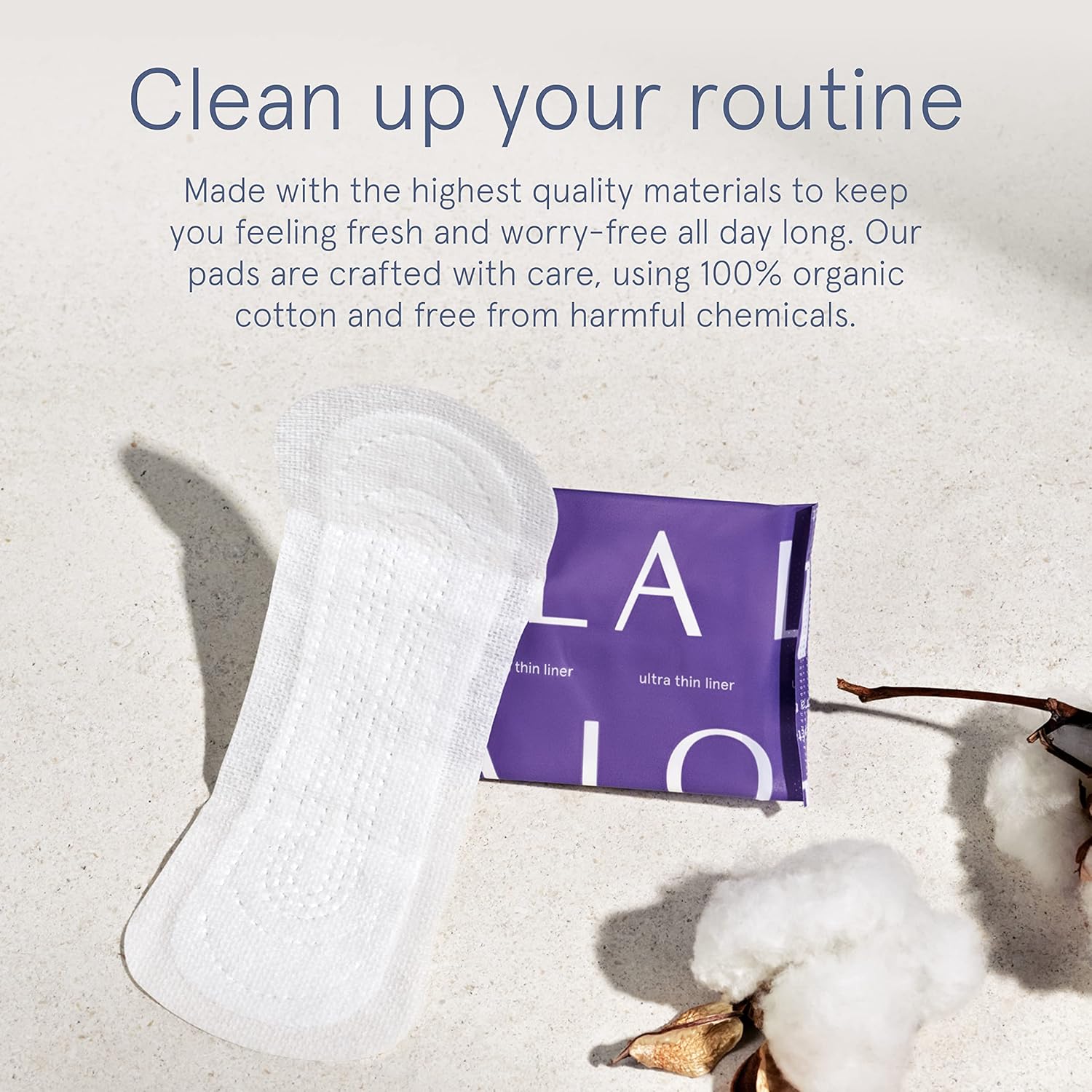 - 100% ORGANIC COTTON COMFORT: LOLA ultra thin pads or organic pantyliners for women feature a 100% organic cotton top sheet and core, with an hourglass shape and soft, flexible edges. These cotton panty liners for women deliver comfort and dependability