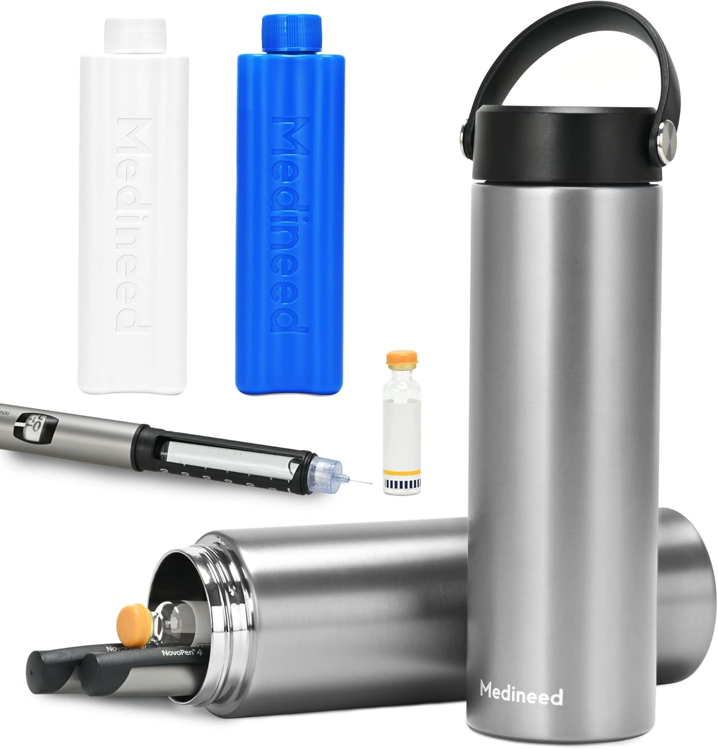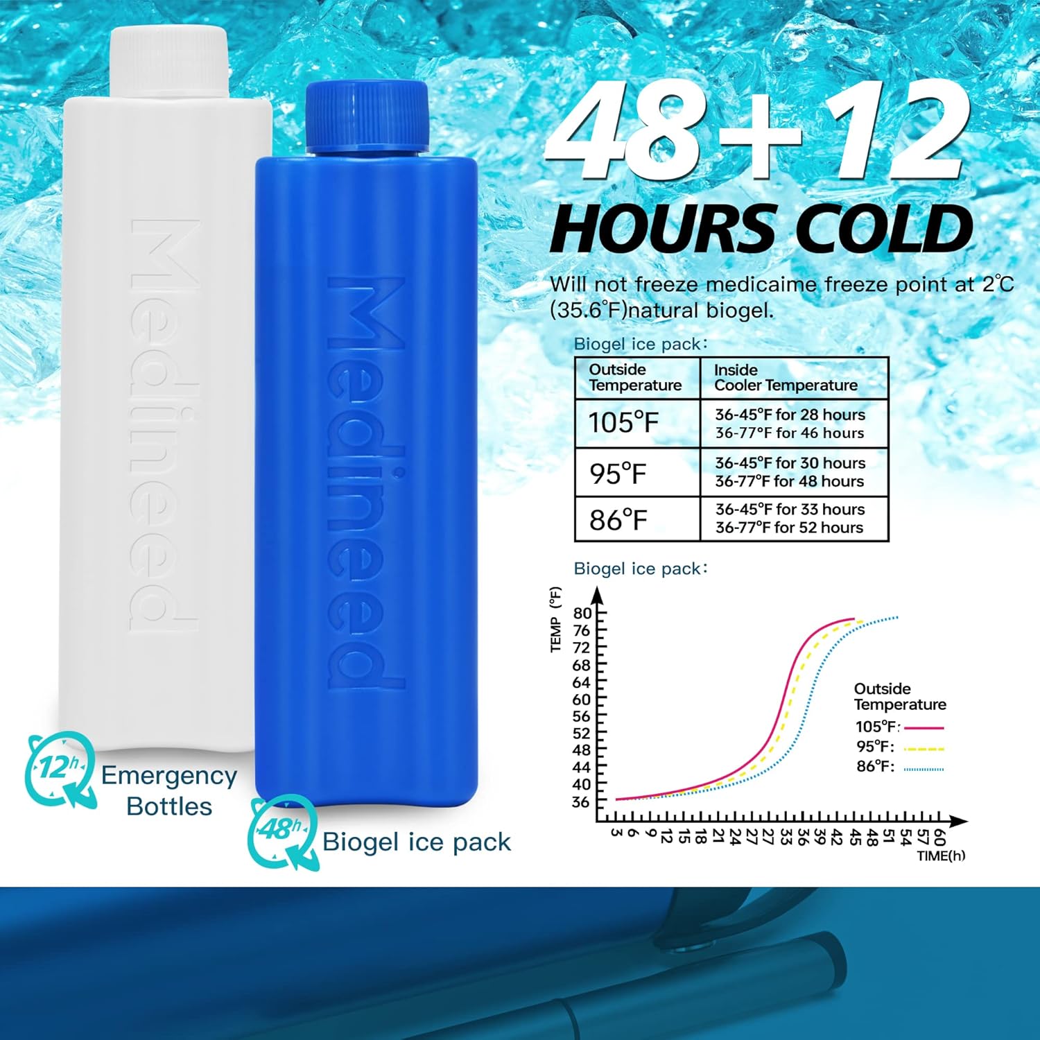 - GOOD COOLING: MEDINEED insulin cooler travel case solve the problem of refrigerating medications on the go; Biogel ice pack has great cooling capacity, even if at an ambient temperature of 105℉, ensuring that insulin would keep the temperature at 36-45℉ for 28 hours