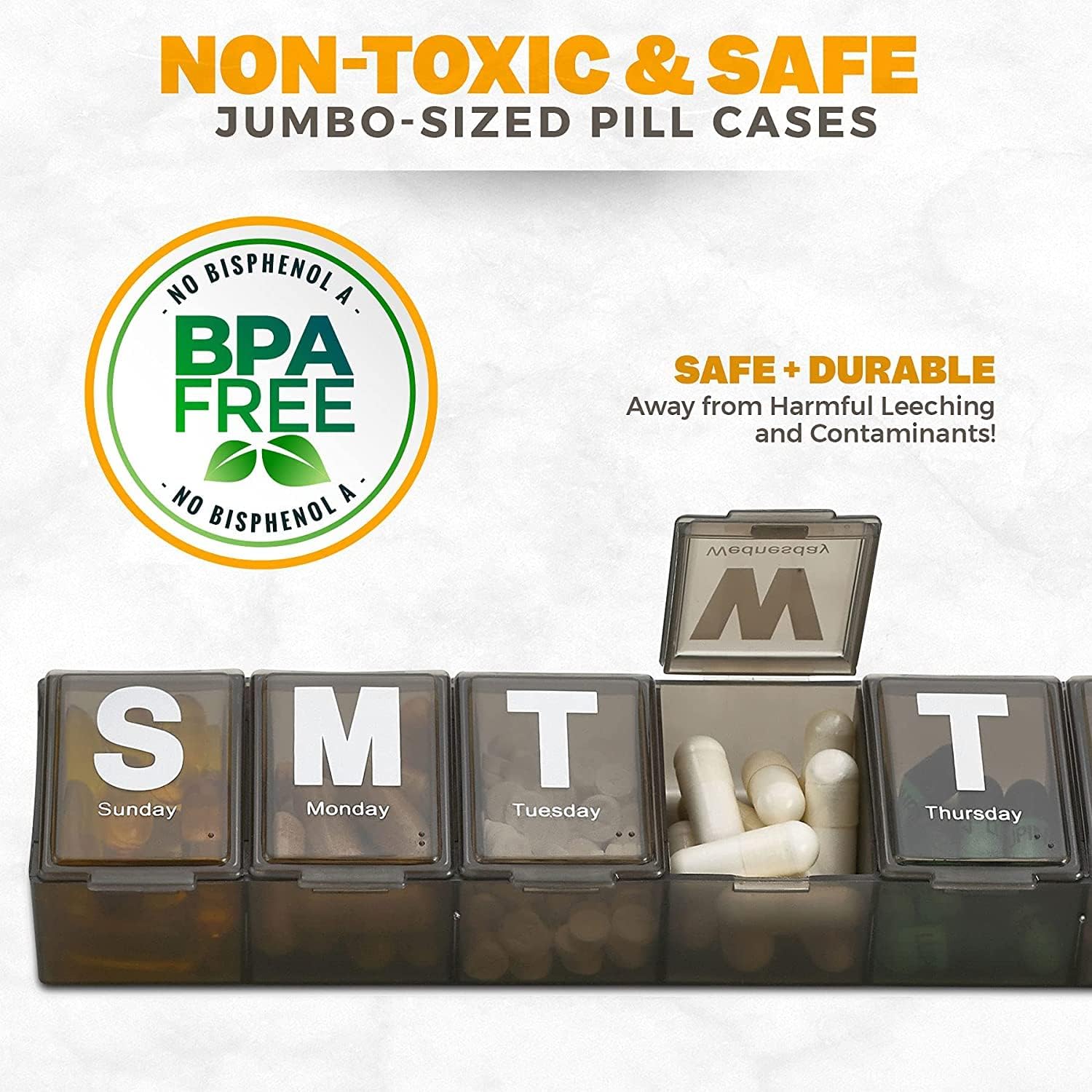 - BPA FREE! SAFE + DURABLE: Unlike other pill cases which break or crack during shipping, our product is made from an extra durable plastic which means that your medication is kept safe and secure. Our product is BPA FREE and NON-TOXIC. That means your medications is safe in our weekly pill organizer and away from harmful leeching and contaminants!