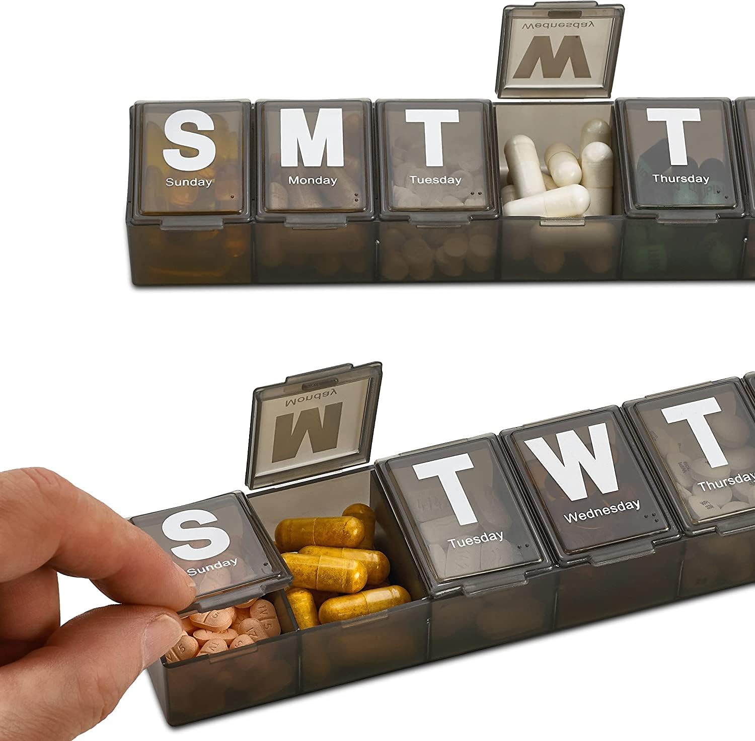 - NEVER MISS A DOSE: The problem with other daily pill organizer is you can't see what is in them. Our pill container solves that problem! Why? That’s because our medication organizer was made using separate and translucent lids. Because we make our Weekly Pill Organizer this unique way, it means that it's easy to see if you took your daily dose.