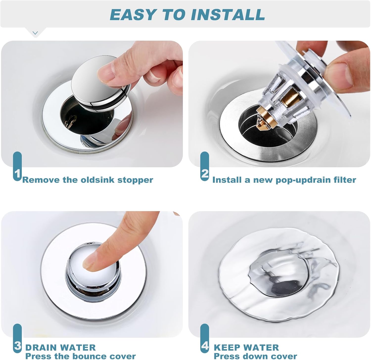 - 2.Easy to Use Pop Up Design: Our Pop Up Sink Drain Stopper is designed for convenience. Simply push down to seal the drain or pop up to quickly release the water. No more hassle with traditional stoppers that get stuck or fail to seal properly.