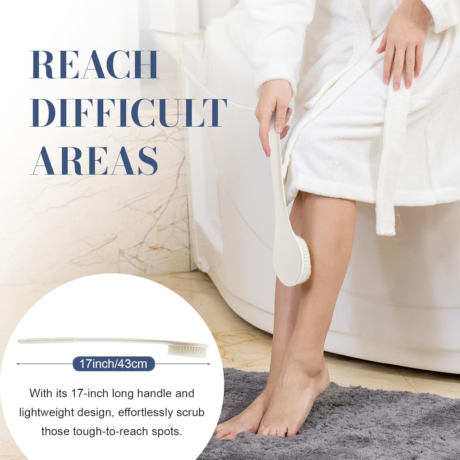 - EXTENED LENGTH OF REACH: To cater to its multi-functional role as a back brush for showering, we've upgraded the handle length to 17 inches, allowing you to effortlessly cover hard-to-reach areas like your back, lower legs, and feet without bending over. This feature proves particularly valuable for individuals with limited shoulder mobility or difficulty in bending their waist. Additionally, its slight curvature enhances ease of use with every stroke.