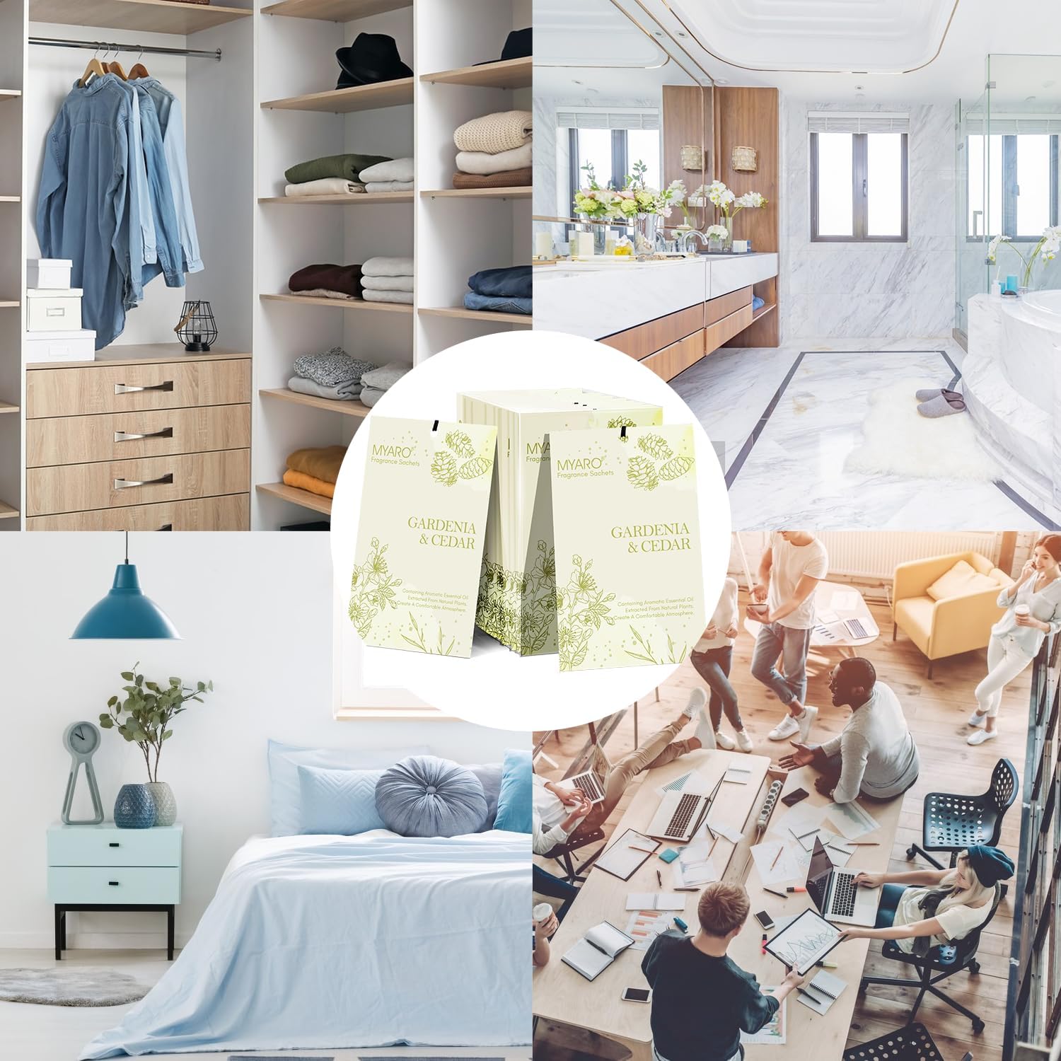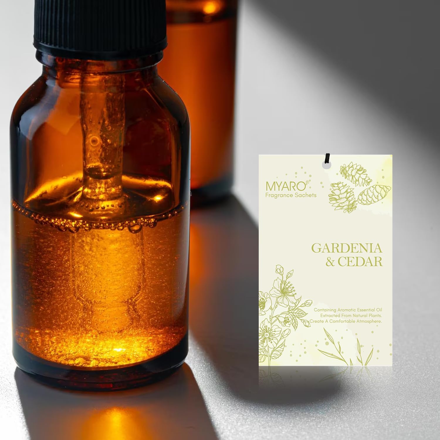 - MYARO 12 packs Scented Sachets for Drawer and Closet - Superior quality sachets made from only vermiculite of natural organic quality and add with high quality top essential oil. Can let your closet exude a fresh breath, make the room freshener dissipate well and last longer. Gardenia and Cedar essential oil fragrance is infused into the sachet, and the sachet bag releases the scent for you to enjoy!