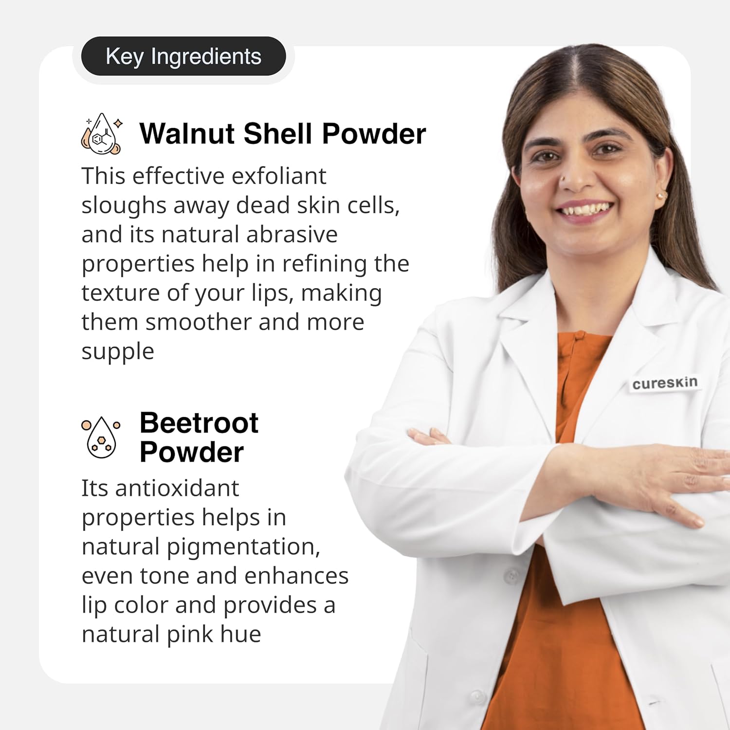 - Active Ingredients : Walnut Shell Powder, Beetroot Powder, Squalane