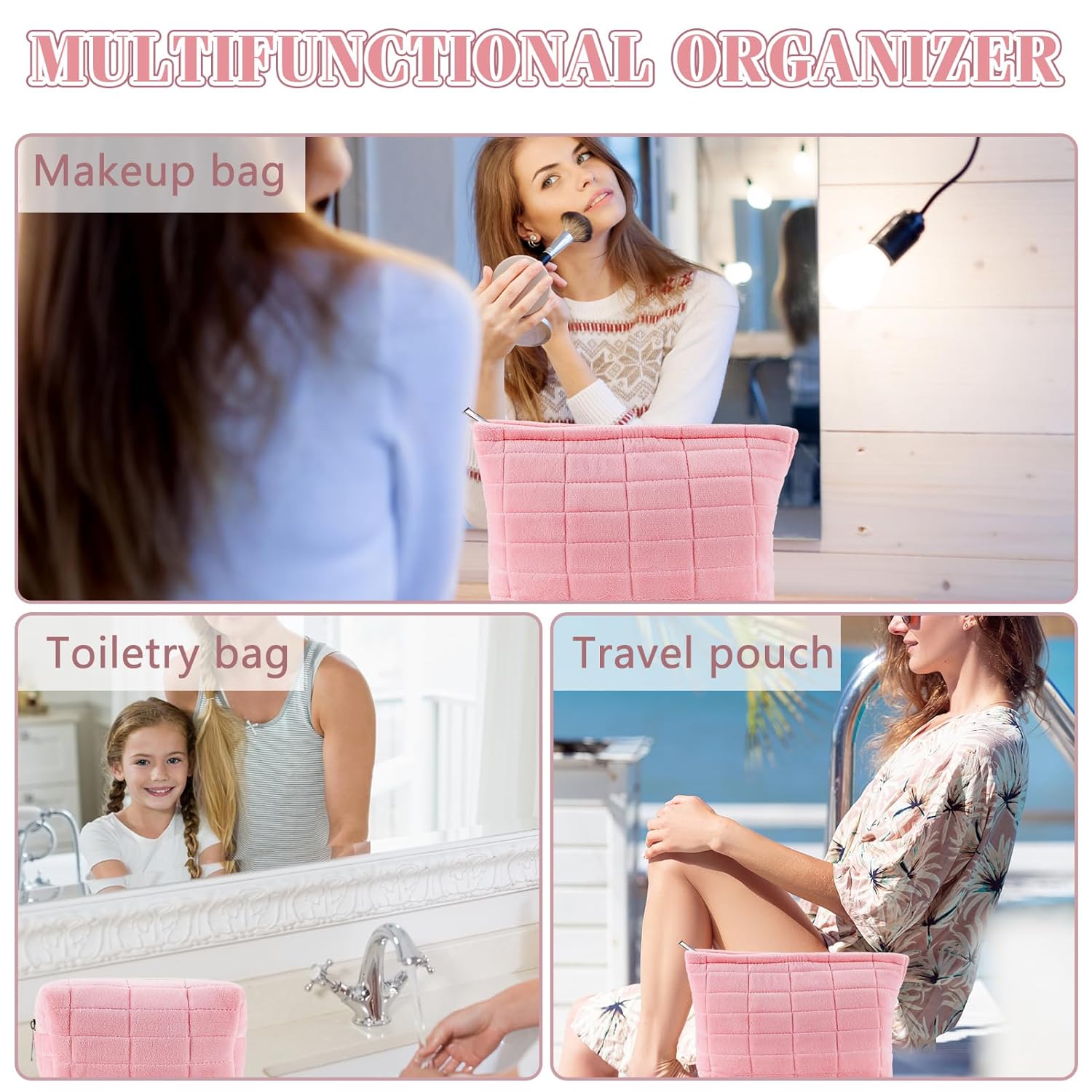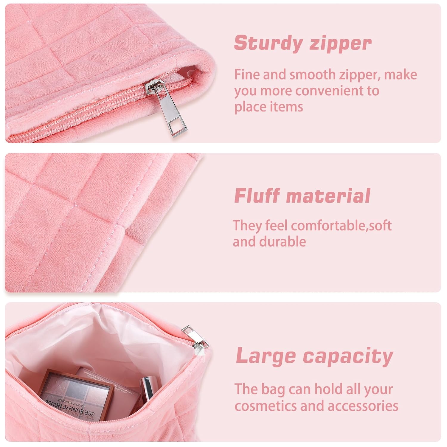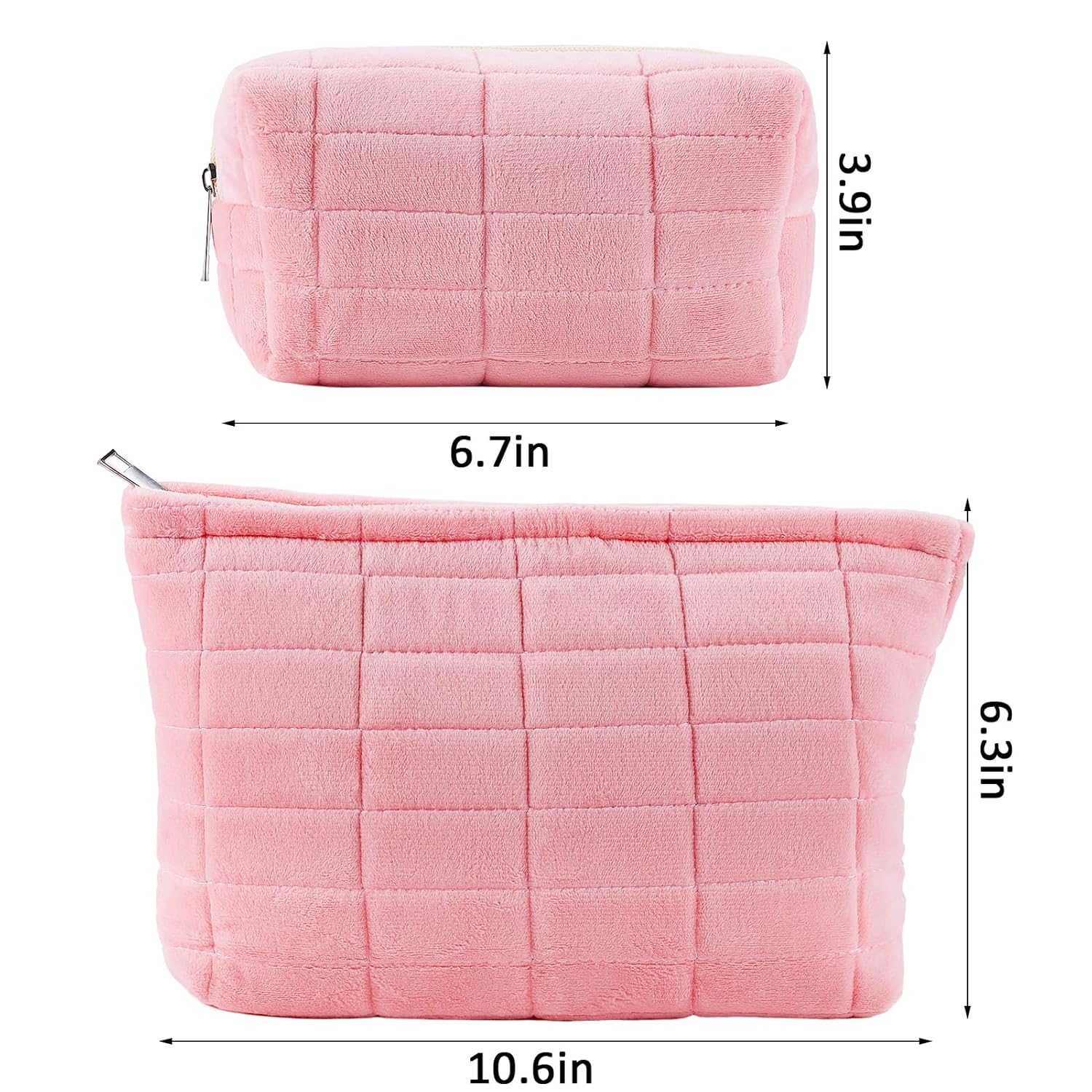 ZLFSRQ 2Pcs Makeup Bag for Women Trendy Large Capacity Cosmetic Bags Plush Pencil Case Pink Checkered Pouch for Purse Coquette Zippered Toiletry Bag Organizer Y2K Aesthetic Pencil Pouch