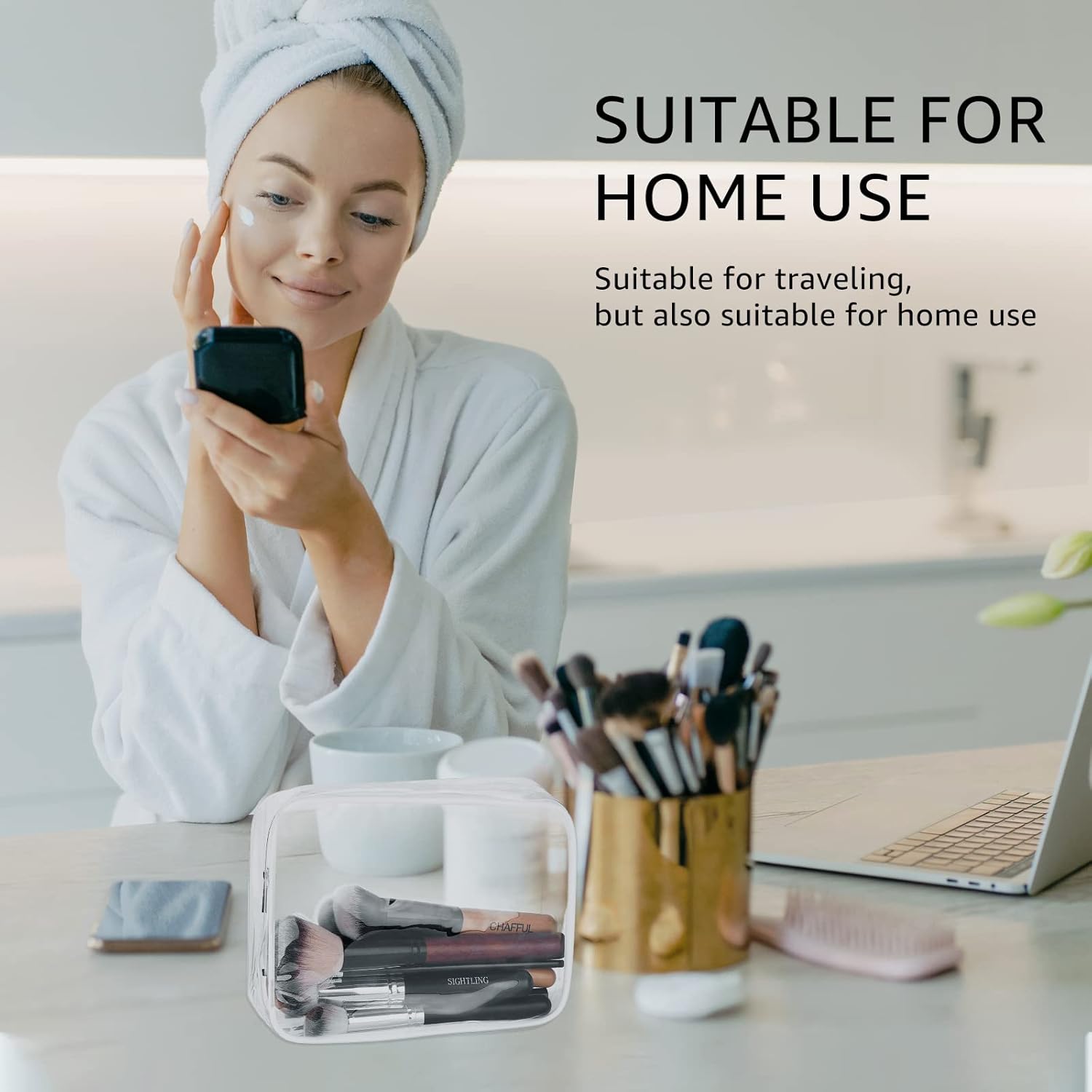 - Improved 0.6mm thickened transparent PVC material, softer and more pliable, durable and reusable; 5 PACKS 3 DIFFERENT SIZES: 1x Large clear toiletry bag (11.8" x 3.9" x 8.7"), 2x Medium clear makeup bag (9.5" x 1.9" x 7.9"), 1x Small clear cosmetic bag (7" x 1.6" x 5.5")