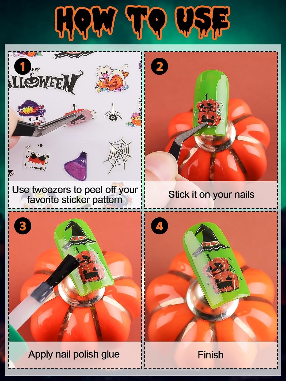 • 【Easy to Use】3D Self-adhesive Halloween nail stickers make it easy to stick well on your nail. Just use tweezers to peel and stick it on your nail. We suggest you can also use nail gel top coat to cover to make the stickers last longer. These are NOT water transfer ones!