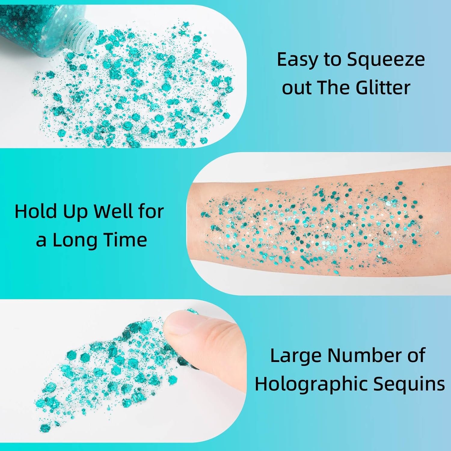 MEICOLY Teal Body Glitter,Mermaid Face Glitter Gel for Halloween Face Paint,Dazzle Green Chunky Glitter for Face Body Eye Lip Hair,Sparkling Holographic Gel Glitter Makeup for Women and Kids