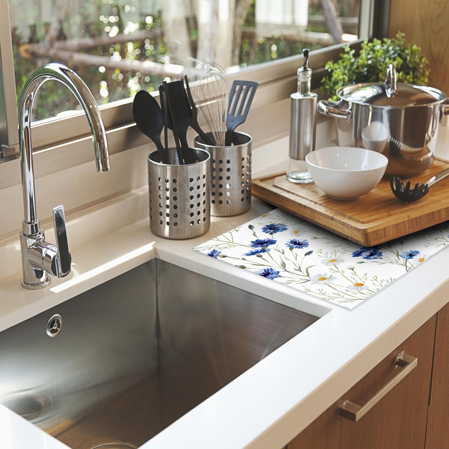 - MULTI-FUNCTIONAL: You can let it catches drips under a dish drying rack to keep the counter dry and clean, or you can place bottles, pots, pans, plates, bowls, cups, knives, silverware, serve ware, glassware, stemware, tableware and so on directly on the mat.
