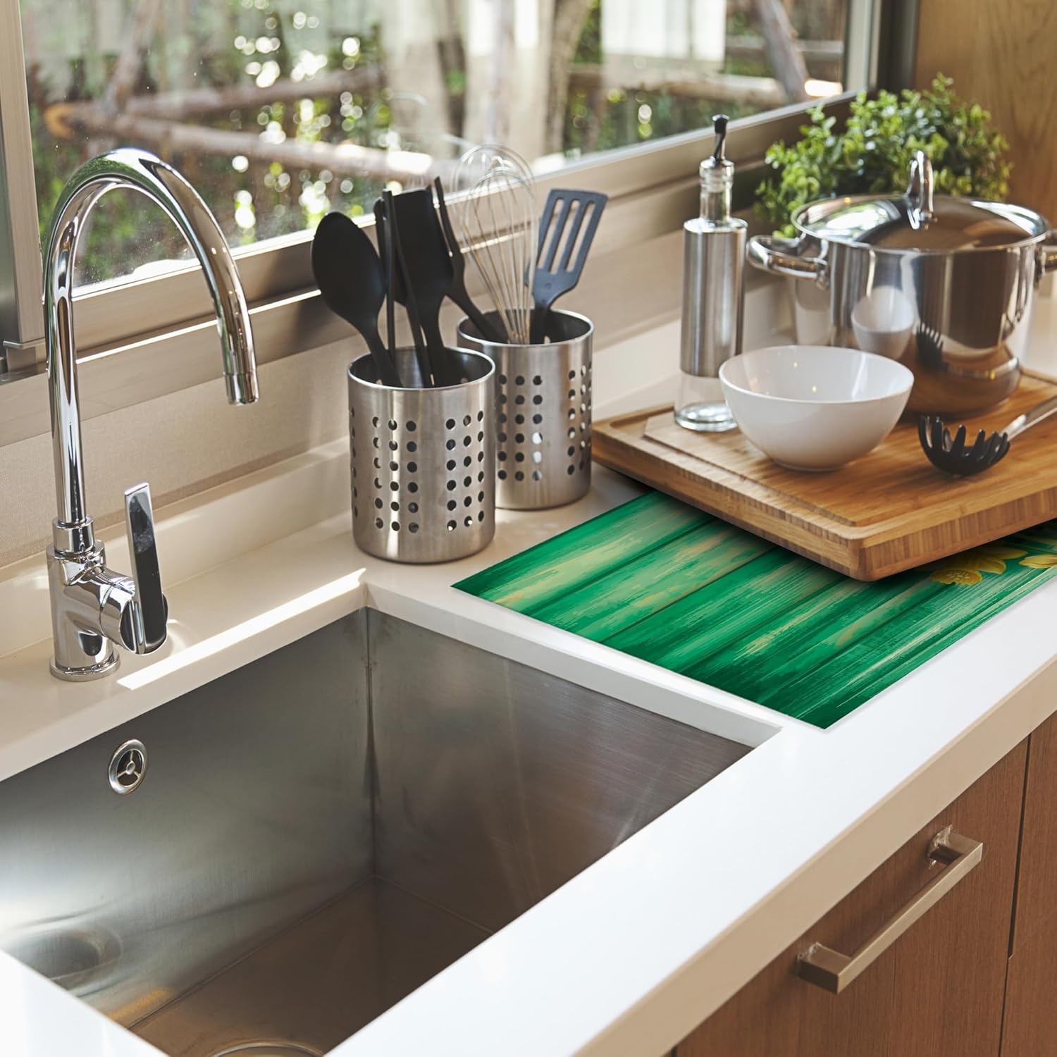 - MULTI-FUNCTIONAL: You can let it catches drips under a dish drying rack to keep the counter dry and clean, or you can place bottles, pots, pans, plates, bowls, cups, knives, silverware, serve ware, glassware, stemware, tableware and so on directly on the mat.