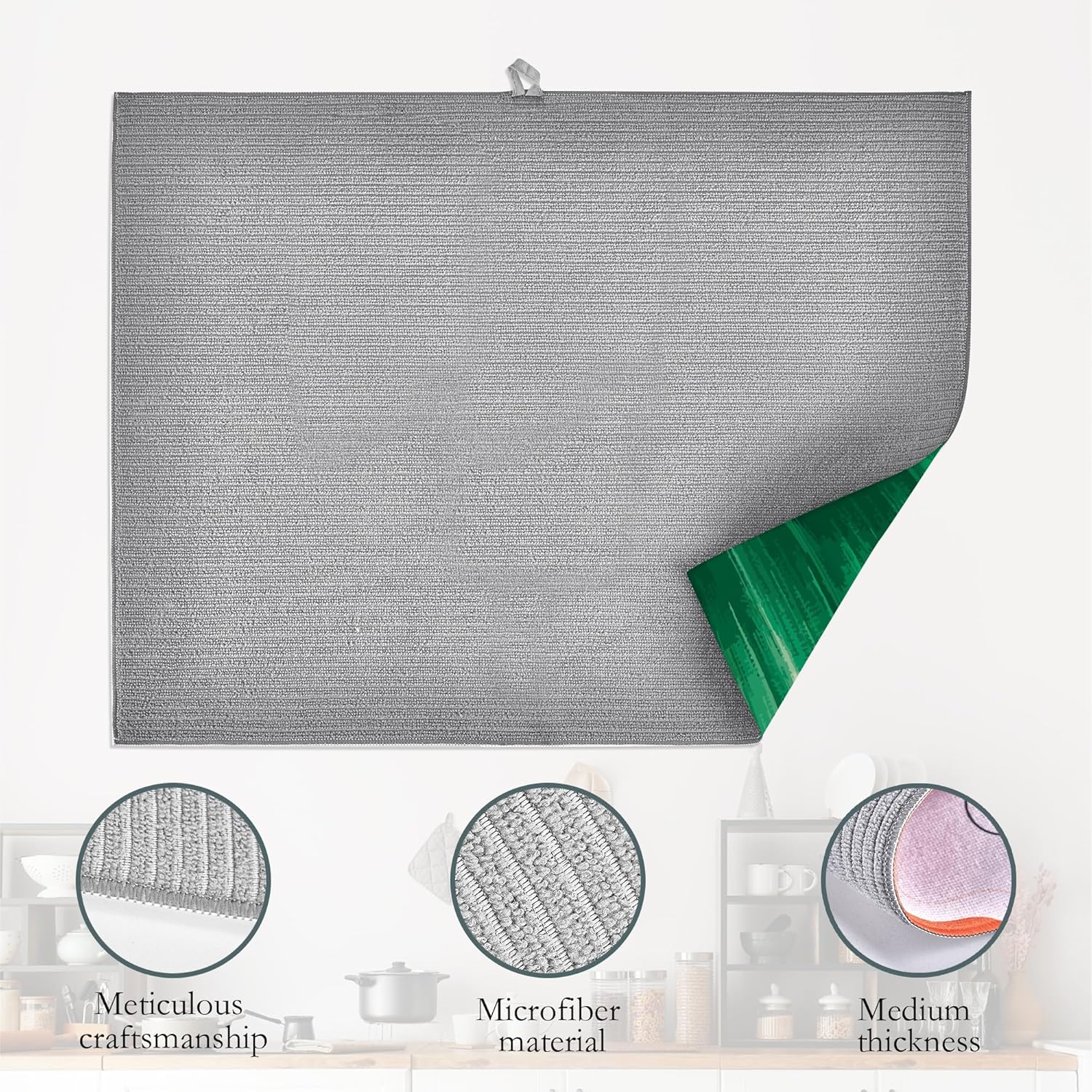 - QUICK DRY: Microfiber terry cloth on the other side absorbs 4X its weight in water, easily keep your counter dry. Our drying mat will suck up all the leftover wetness from your pots, pans, and dishes, and leave the underside both dry. Use alone or pair with a dish drying rack.Offered in rich color options these drying mats are the perfect functional addition to your kitchen decor.