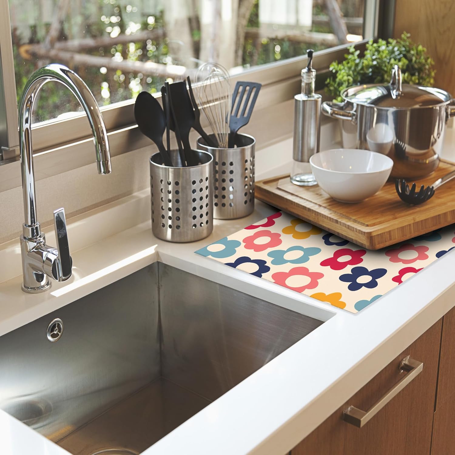 Vintage Groovy Flowers Dish Drying Rack Mats Decor,Colorful Daisy Dish Pad Drying Mat Kitchen Counter 18x24 Inch Absorbent Reversible Microfiber for Coffee Bar Sink Countertop