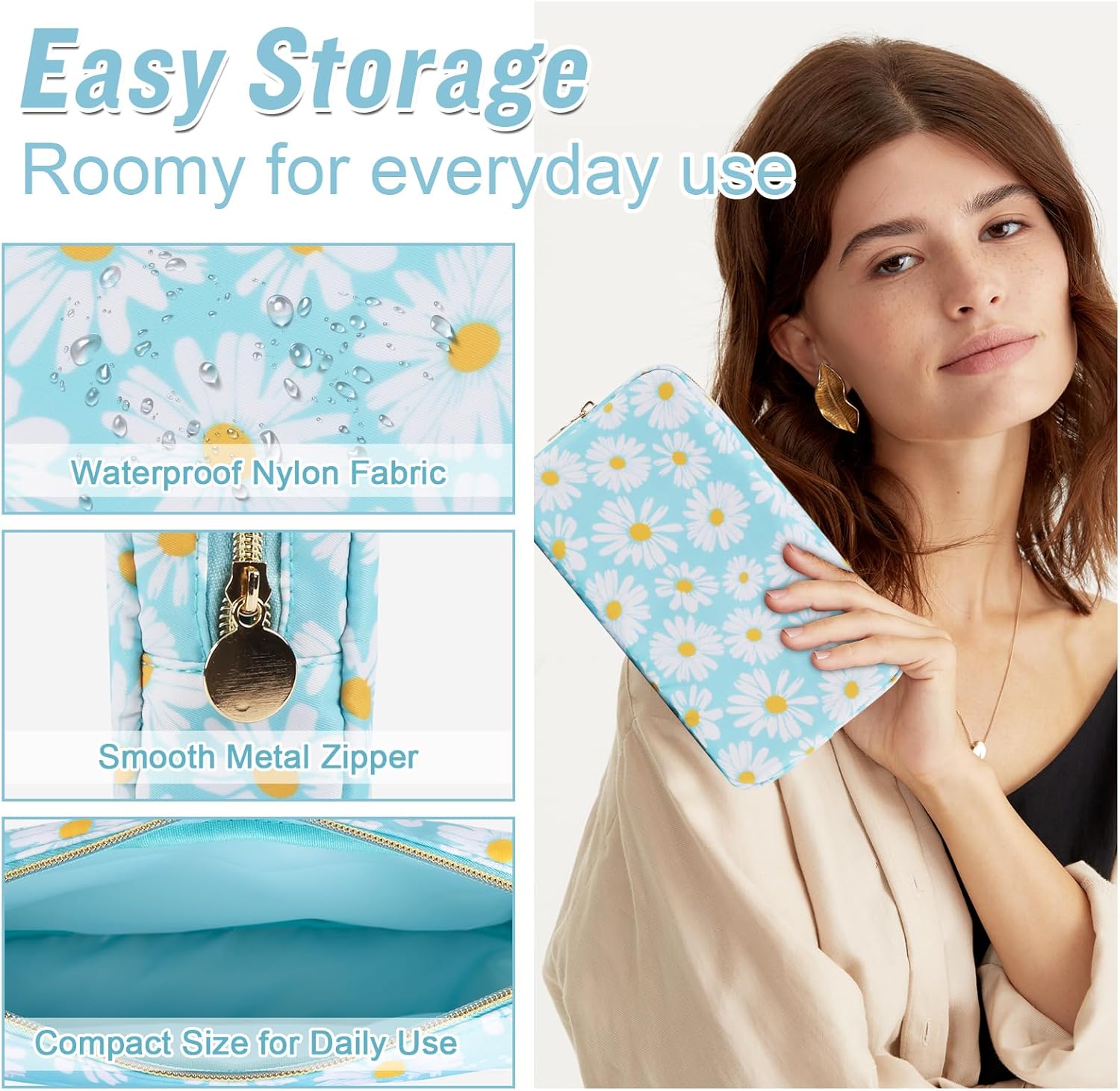 - ❤【Multiple Sizes & Colors】Large, Small, Mini, or Slim, we have it all! Cosmetic bags are available in many colors: Blue-Daisy, Green-Daisy, White-Flower, Pink-Flower and other colors for you to choose. Nylon makeup bag for purse can be used for travel, outdoors and organization, it can be used as a coin pouch, purse bag, travel pouch, clutch, makeup organizer and more.