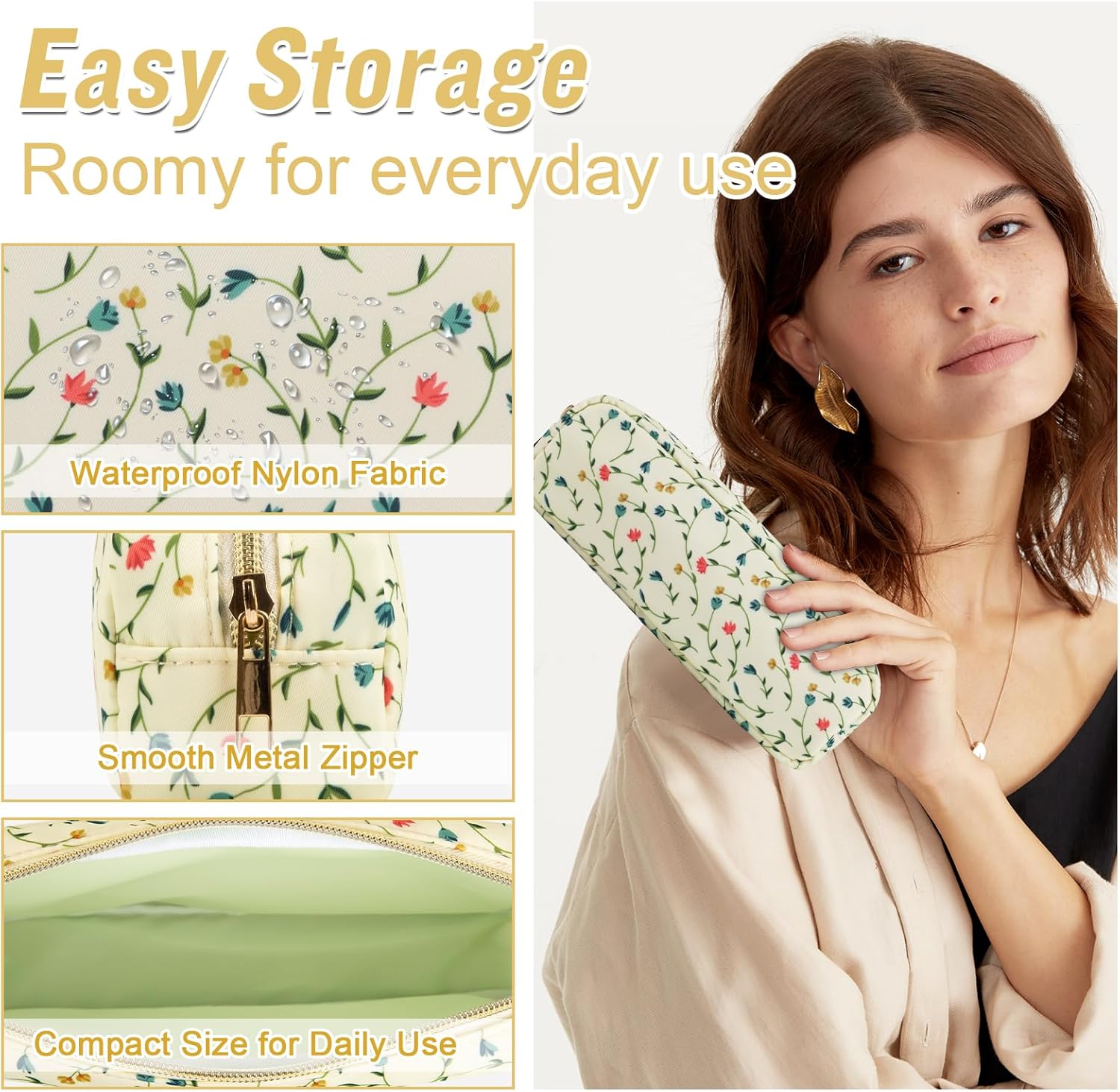 - ❤【Multiple Sizes & Colors】Large, Small, Mini, or Slim, we have it all! Cosmetic bags are available in many colors: Blue-Daisy, Green-Daisy, White-Flower, Pink-Flower and other colors for you to choose. Nylon makeup bag for purse can be used for travel, outdoors and organization, it can be used as a purse bag, travel pouch, clutch, makeup organizer and more.