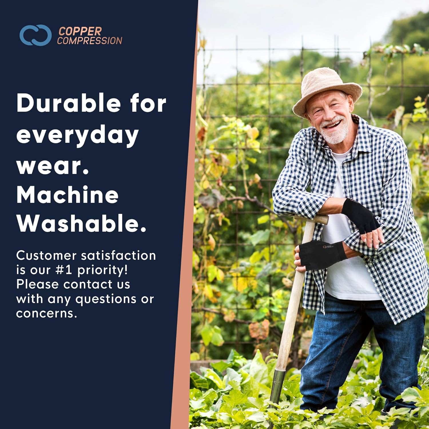 - FIND THE STRENGTH TO HEAL. Copper Compression's Arthritis Gloves provide you with the compression you need to help reduce swelling and pressure, increase blood flow, restrict excess fluid build-up, and relieve aching and soreness in joints. The therapeutic value of these fingerless gloves provides support in managing medical conditions such as: arthritis, carpal tunnel, tendonitis, typing, texting, purlicue pain and repetitive stress injuries.