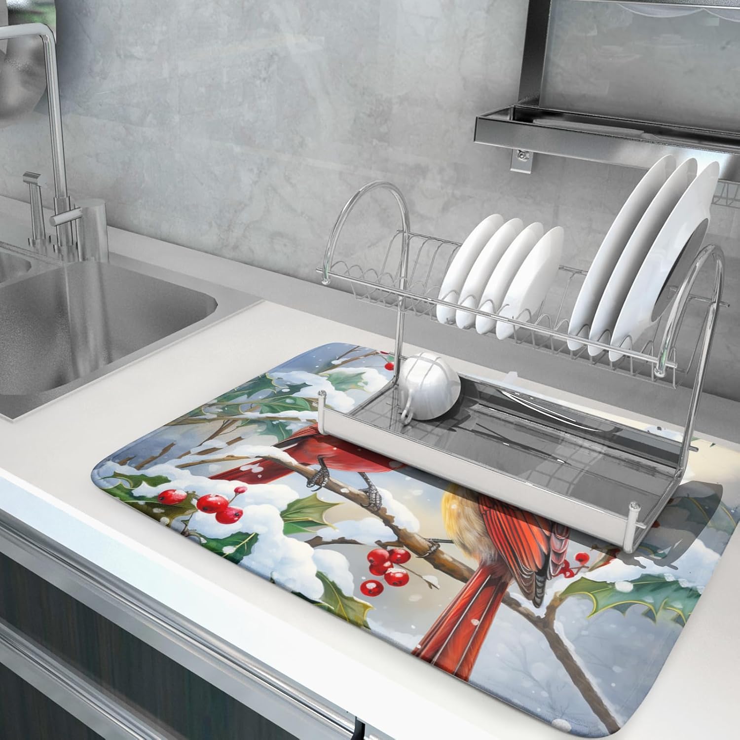 Winter Cardinals Dish Drying Mat for Kitchen Counter - Absorbent Reversible Microfiber Pad, Drainer Rack for Coffee Bar, 18x24 Inch, Red
