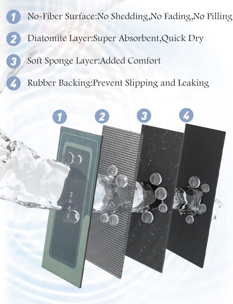 - Innovative Soft Diatomaceous Earth Bath Mat: Experience the perfect blend of comfort, functionality, and innovation with our luxury bath rug. Bathroom floor mat features a smooth leather-like surface for easy maintenance, a cushioning sponge layer for added comfort, a super absorbent and quick-drying soft diatomaceous earth layer, and a durable rubber backing for added stability.