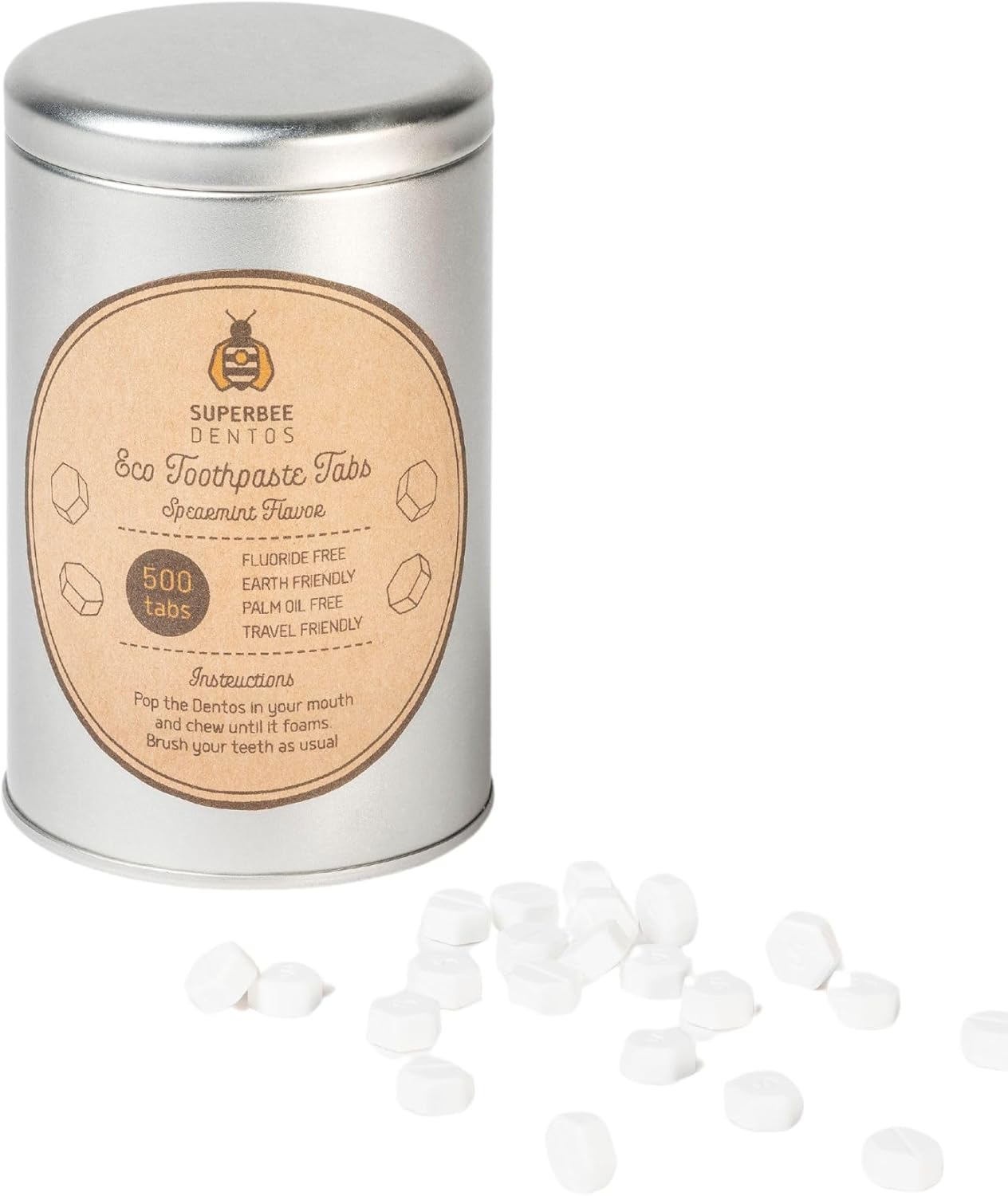 SuperBee Dentos Toothpaste Tablets, 500 Tabs, Fluoride Free & Eco Friendly, Travel Mouthwash Tablets, Sensitive Bites for Kids and Adults, Chewable Tablet, Spearmint