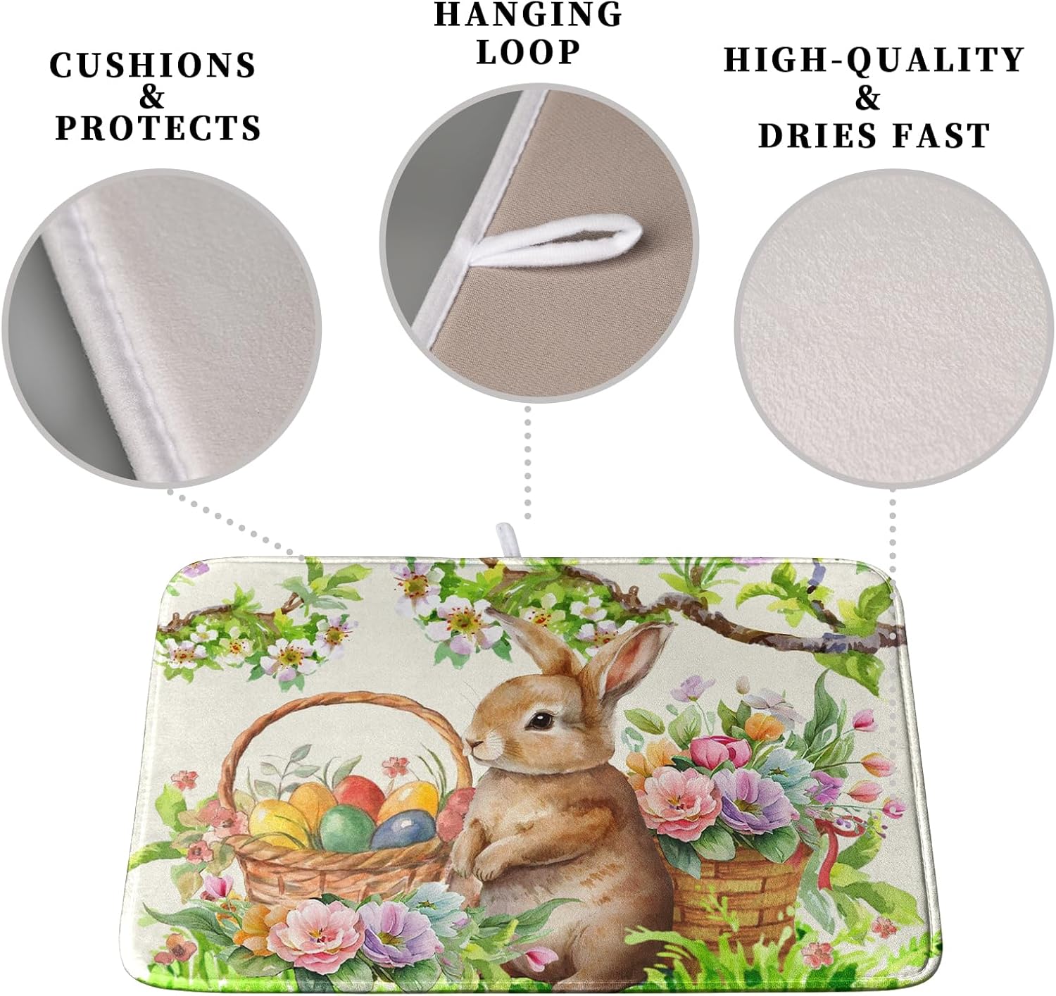 Easter Egg Bunny Dish Drying Mat for Kitchen Counter Floral Flower Basket Drying Mats Absorbent Dish Pad Spring Summer Holiday Large Dish Draining Mat 18x24 inch