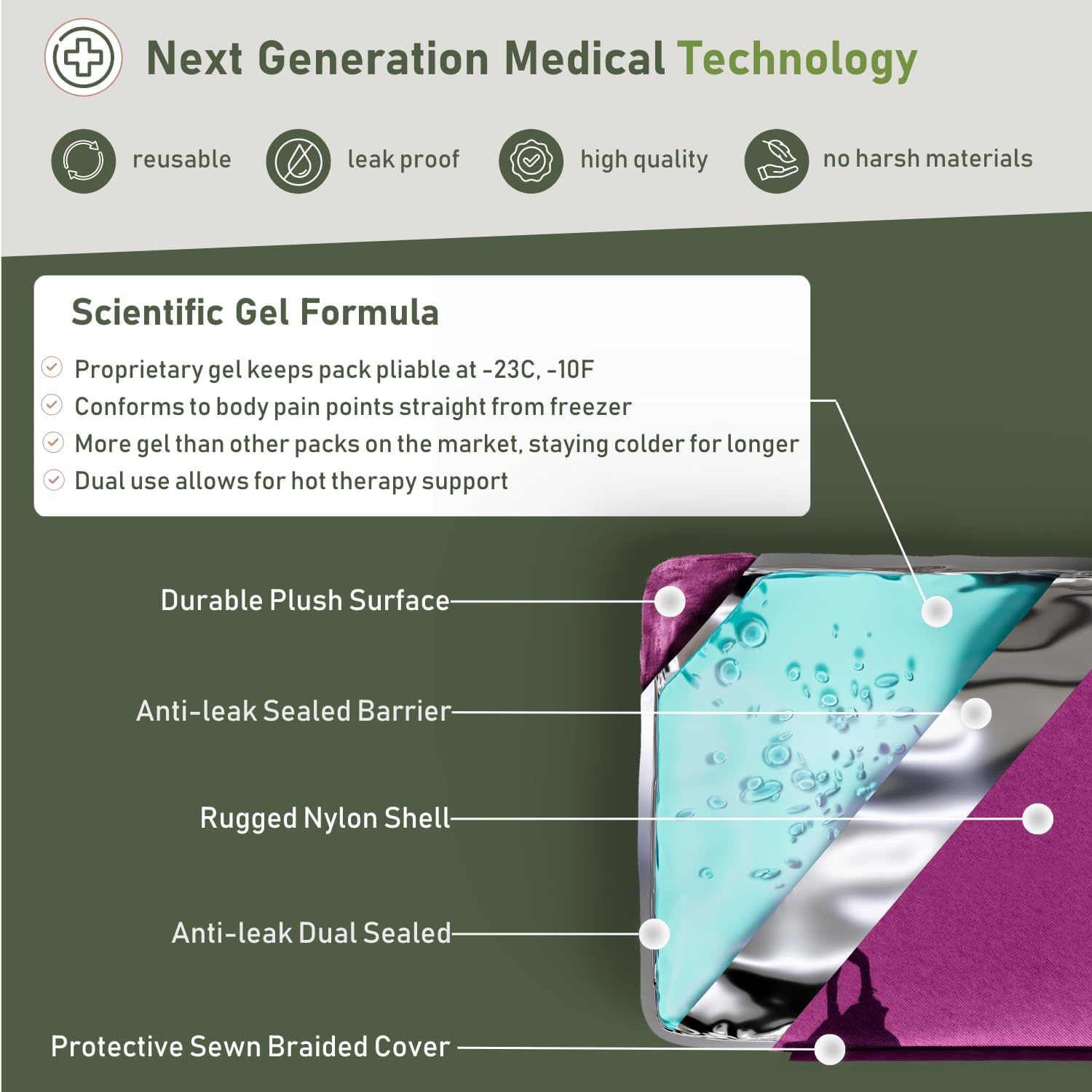 - BUILT TO LAST - With our rugged, durable construction, you can turn to our waterproof gel ice packs for injuries reusable. Designed with protective double-sealed seems to prevent leaking, this non-toxic gel pack is a worry-free addition to your pain relief journey.