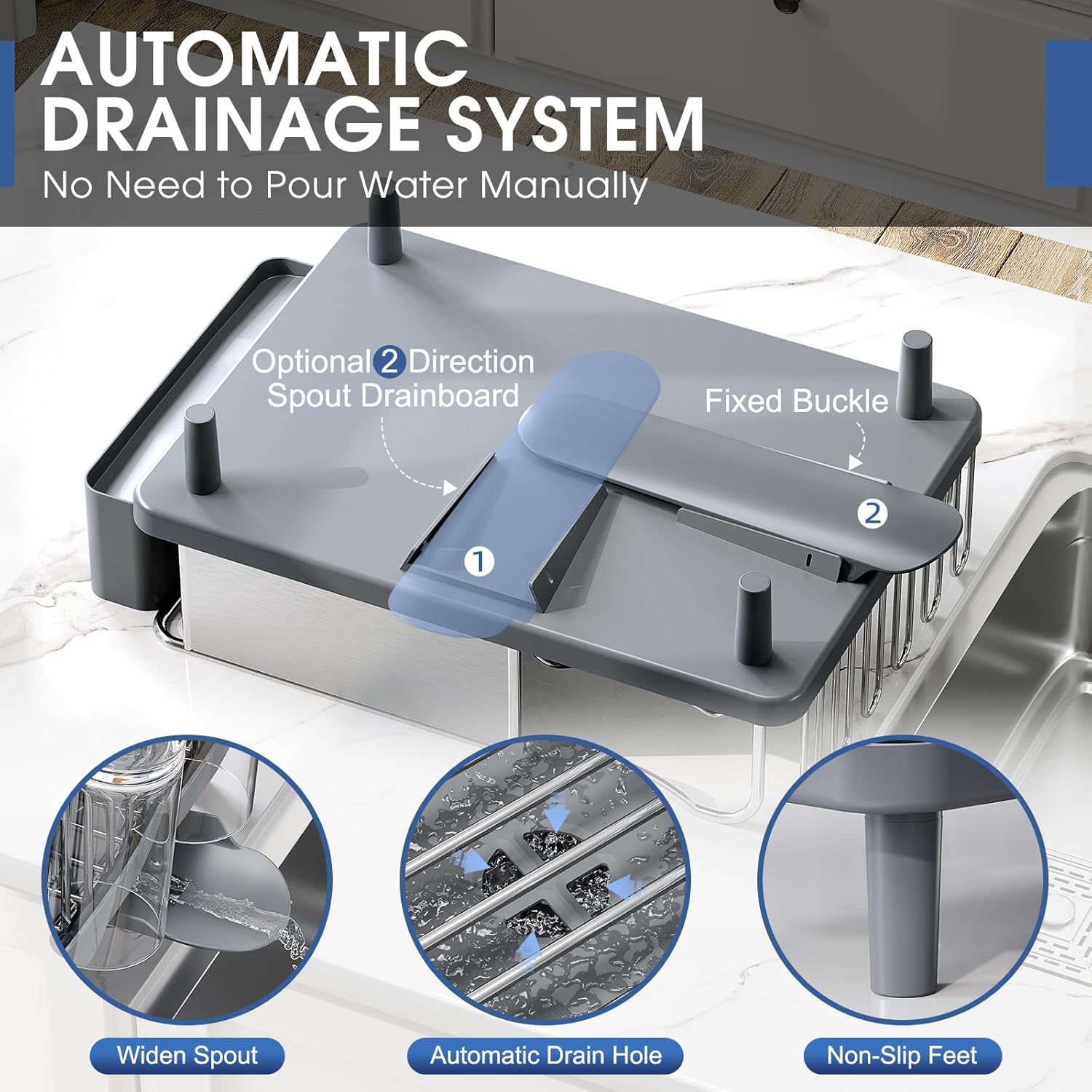 - Adjustable Drainer for Any Countertop: Flip the dish drainer’s spout left/right in seconds! Works with side-by-side sinks, corners, or tight spaces. Water flows straight into your sink – no messy kitchen counter dish drainers here!