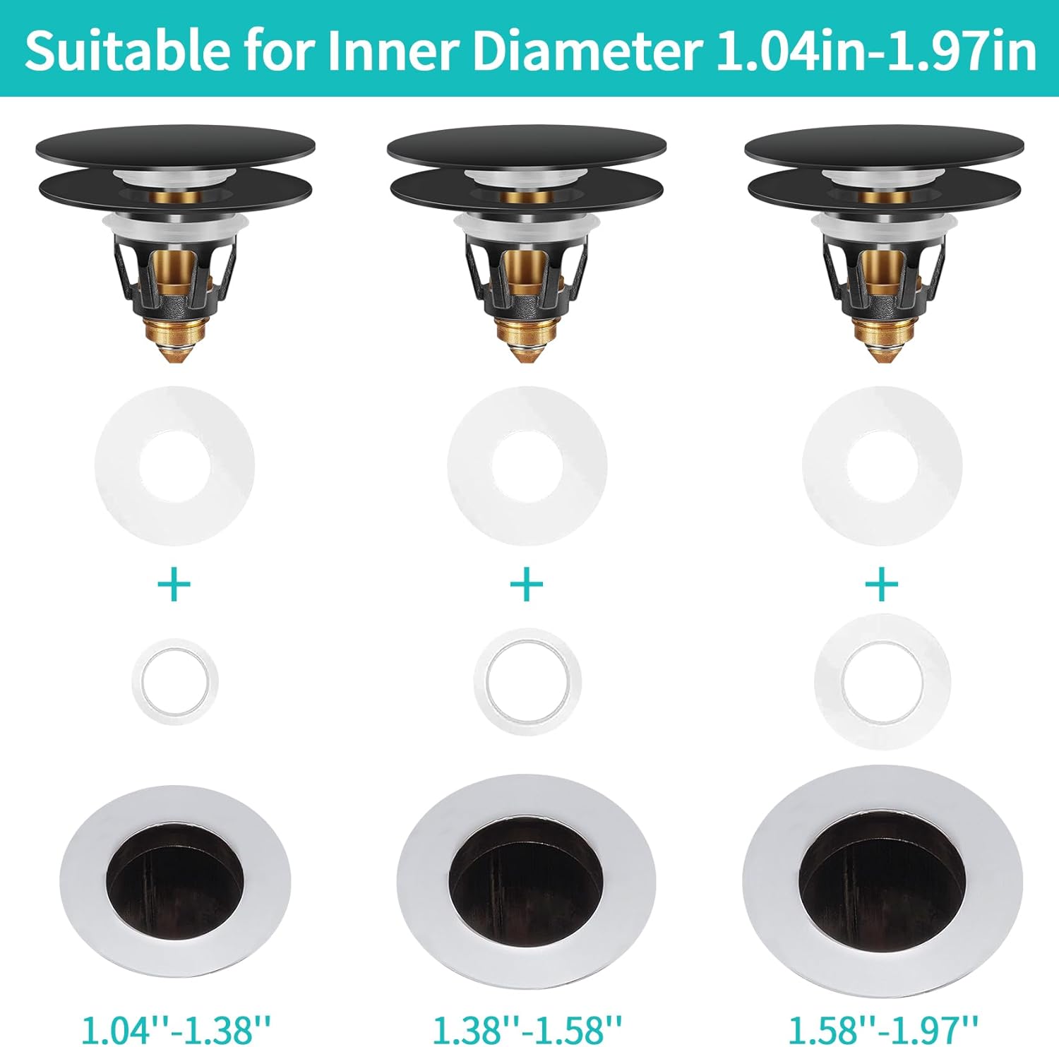 - [ Universal Size ] The bathroom sink stopper plug is mainly made of high quality thickened brass material, can be used for the different types of basin drain. The inner diameter of sink stopper strainer is 1.04’’. Suitable for drain holes with an inner diameter of 1.04-1.97 inch.
