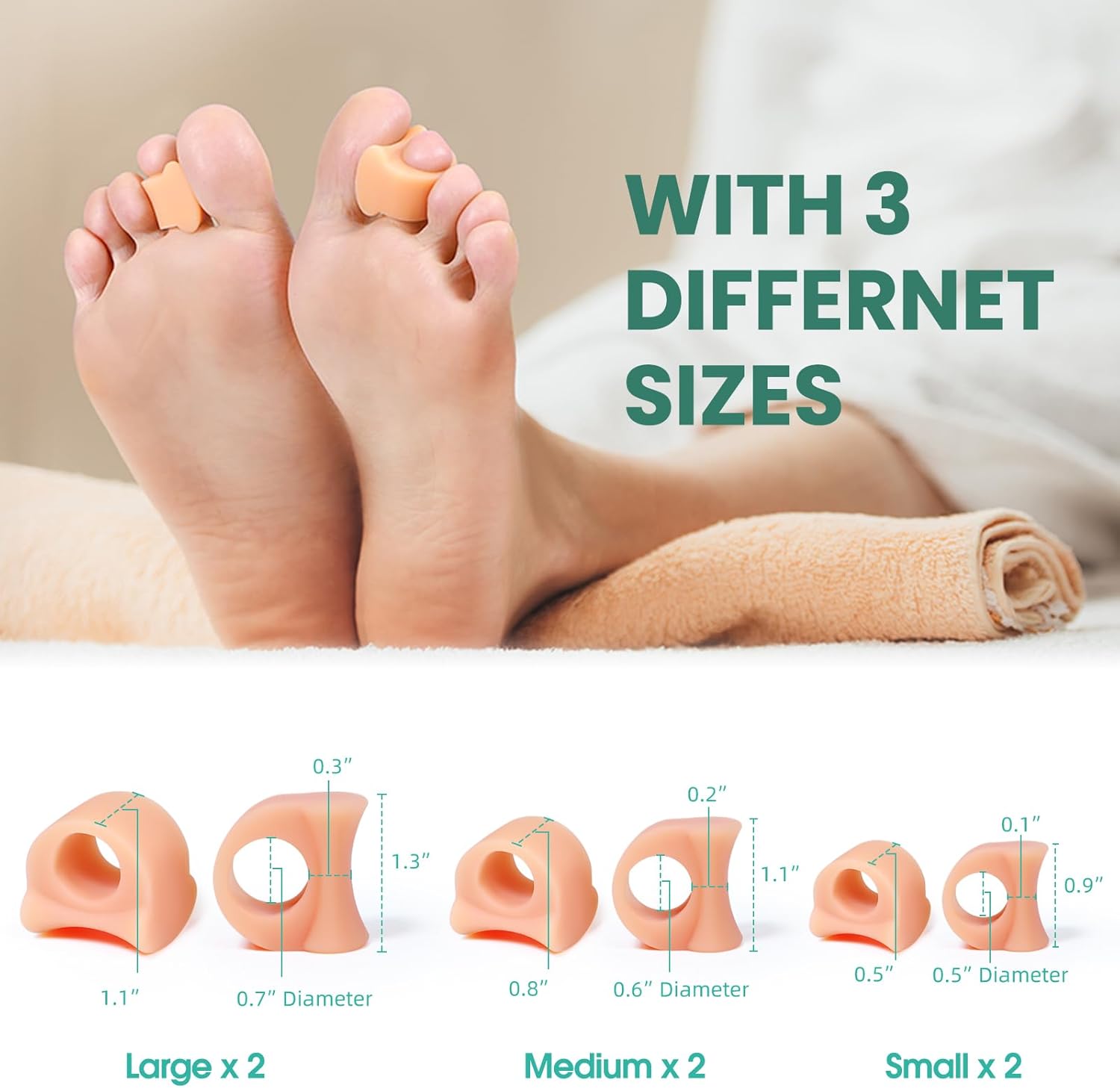 - What You Get: We offer our bunion toe spacer in 3 different sizes (Including 2-pack of large size, 2-pack of medium size and 2-pack small size), so you can find the perfect fit for your toes – even your pinky toe! Our toe separators are suitable for both men and women, and they're comfy and effective for anyone who needs relief from foot pain.