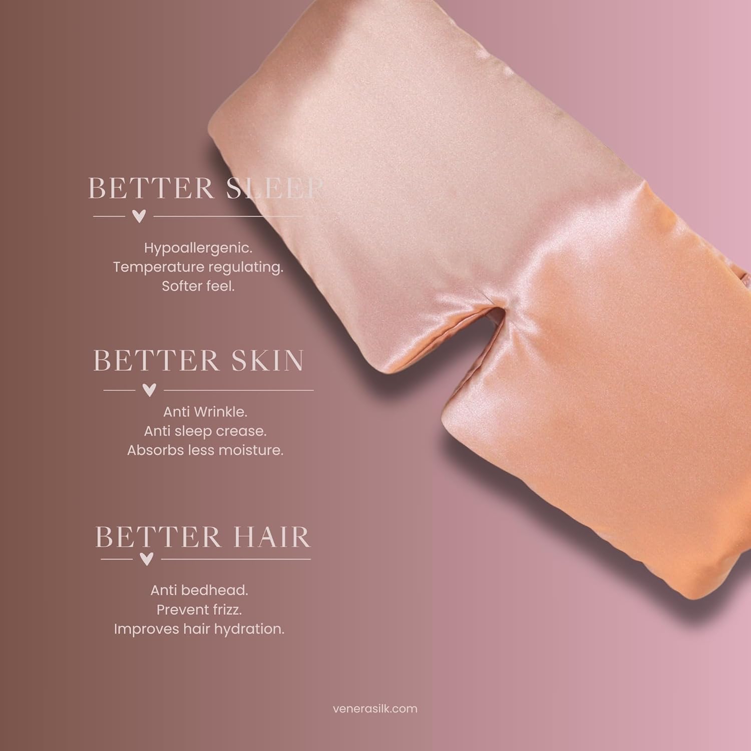 - Benefits: One of the most important components of mulberry silk is "sericin". It’s used in medicine and cosmetics due to its natural infection resistance and its ability to improve the elasticity of the skin. This has been shown to have anti-wrinkle and anti-ageing properties. Mulberry silk is smooth, providing a friction-free surface to rest on for a good night’s sleep. VÉNERA silk sleeping mask reduced creases