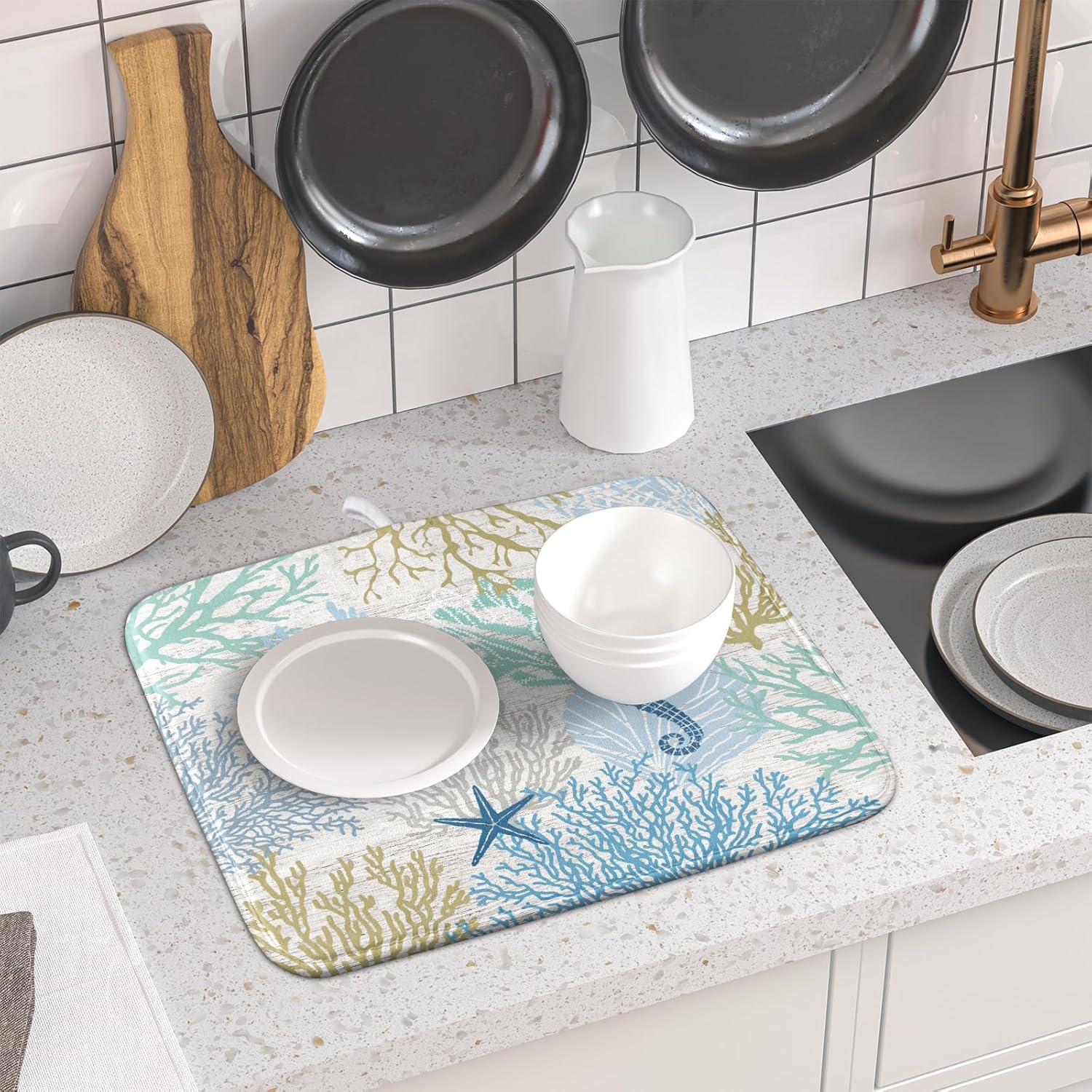 - 【Wide Usage】The dish drying mat designed with nautical coastal pattern, it is beautiful, soft, and durable. Not only a dish drying mat, cup mat, heat resistant mat, you can also use it as a kitchen countertop insulation mat. It is also a good choice to use it as a pet mat, picnic mat.
