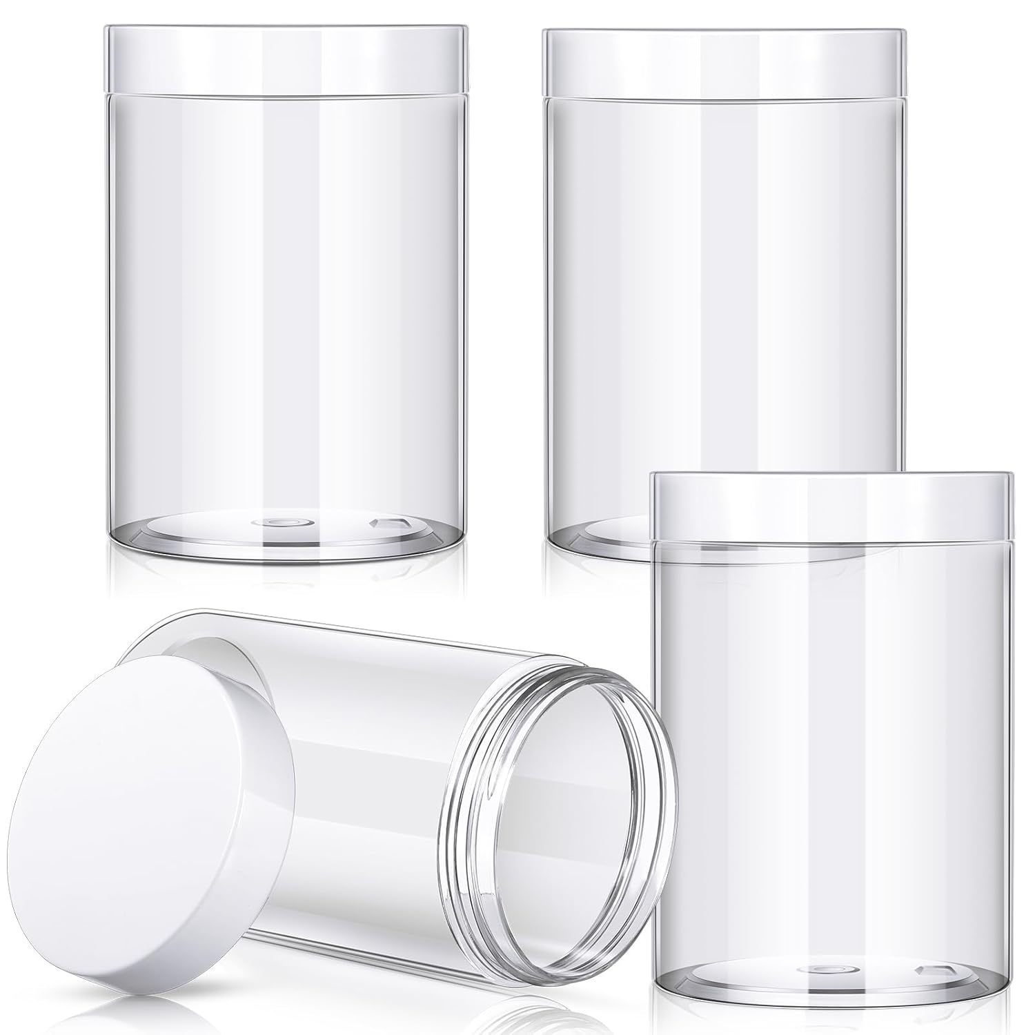 - What you receive: there are 4 pieces plastic jars with white screw-on lids. They are reliable and refillable, measuring about 12 oz in capacity