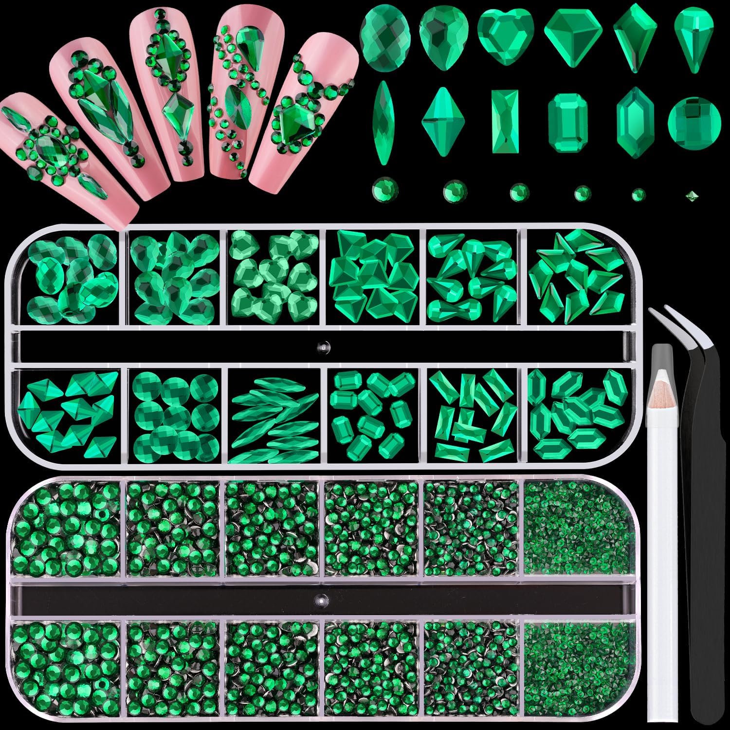 - 💎PACKAGE CONTENT -- The package contains 120Pcs multi shapes flatback gems crystal and 2510Pcs 1.5-4mm round beads, totally 2630Pcs Emerald Green rhinestones. Additionally, 1 tweezers for large size gems and 1 pickup pen for small size gems. This rhinestones kit makes it easy for you to make any nail art you like, and will bedazzle your acrylic nails!