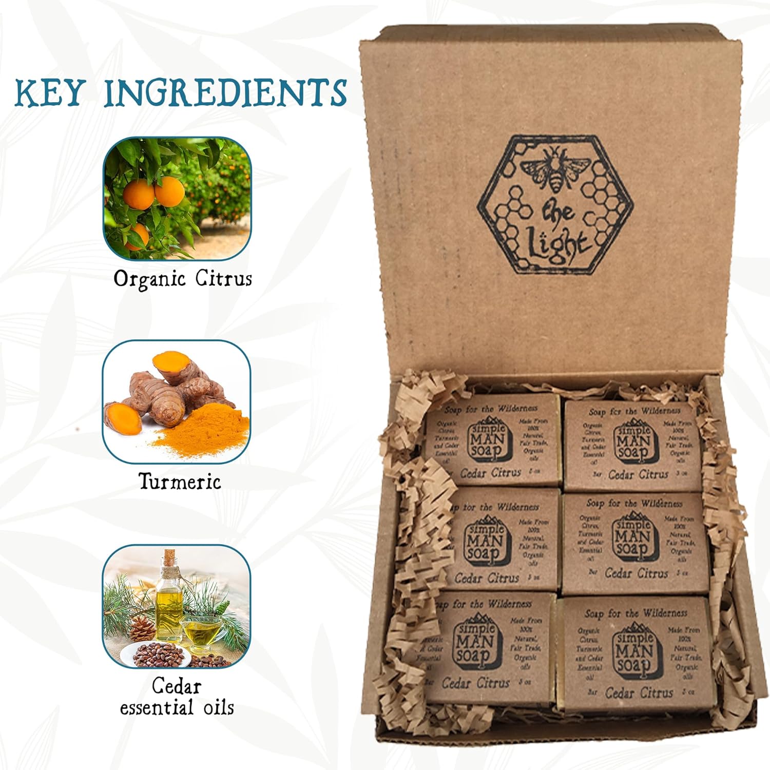 - Skin-loving organic ingredients: Our cold process artisan men's soaps are made in small batches by using organic, fair trade ingredients and pure essential oils. We craft our soap bars by hand using healing and nourishing ingredients like Bentonite Clay, Activated Charcoal, Organic Coconut oil and Turmeric root.