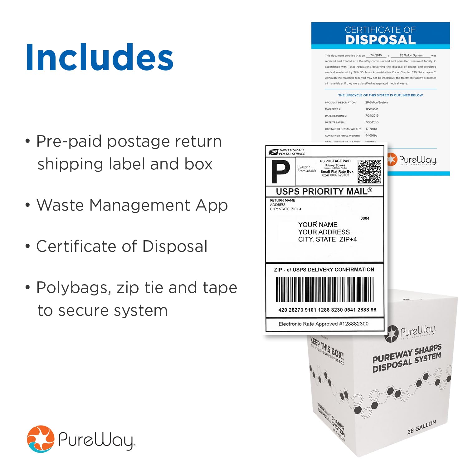 - PREPAID RETURN LABEL: Sharps Kit Includes 18 Gallon Medical sharps container, Mail Back Box, Prepaid return label, an online portal with compliance tracking, and certificate of destruction.
