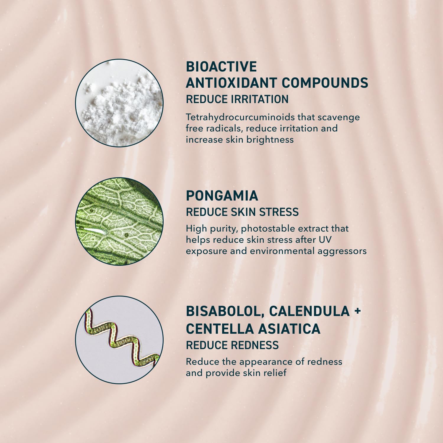 - ANTIOXIDANT SUPPORT. Features tetrahydrocurcuminoids to support skin against environmental stressors, while Pongamia Extract helps address skin stress from UV and impurities. Bisabolol, Calendula, and Centella Asiatica visibly reduce the appearance of redness for soothed skin