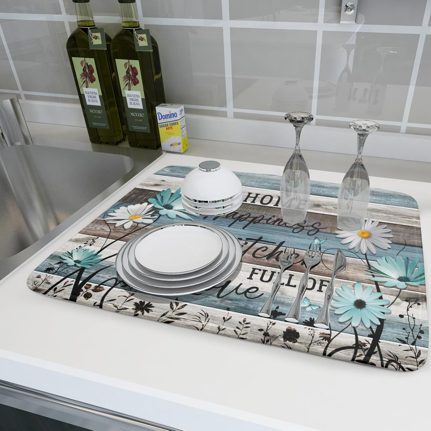 Daisy Floral Dish Drying Mat 18x24 Inches Rustic Wood Microfiber Absorbent Reversible Dish Draining Pad Fast Dry Kitchen Accessories