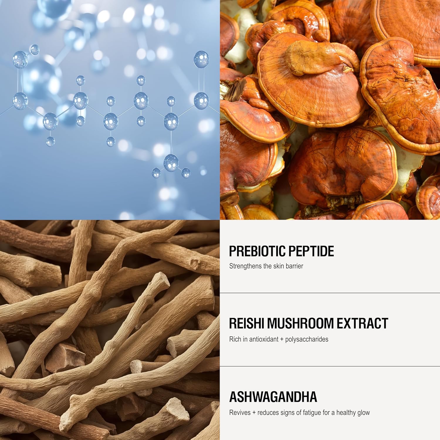- HYDRATING. Formulated with a nourishing blend of ingredients such as Prebiotic Peptides, Ashwagandha and antioxidant-rich Reishi Mushroom, it also helps to hydrate, protect and strengthen the skin barrier