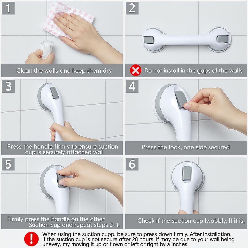 - IMPORTANT NOTE: CIVJET bathroom grab bars are designed exclusively for smooth, non-porous surfaces such as tiles, glass, acrylic, and metal. Avoid installation on porous surfaces or grout lines as these may cause the suction cup to lose its grip. These bars are intended to assist with partial weight support and should not bear full body weight