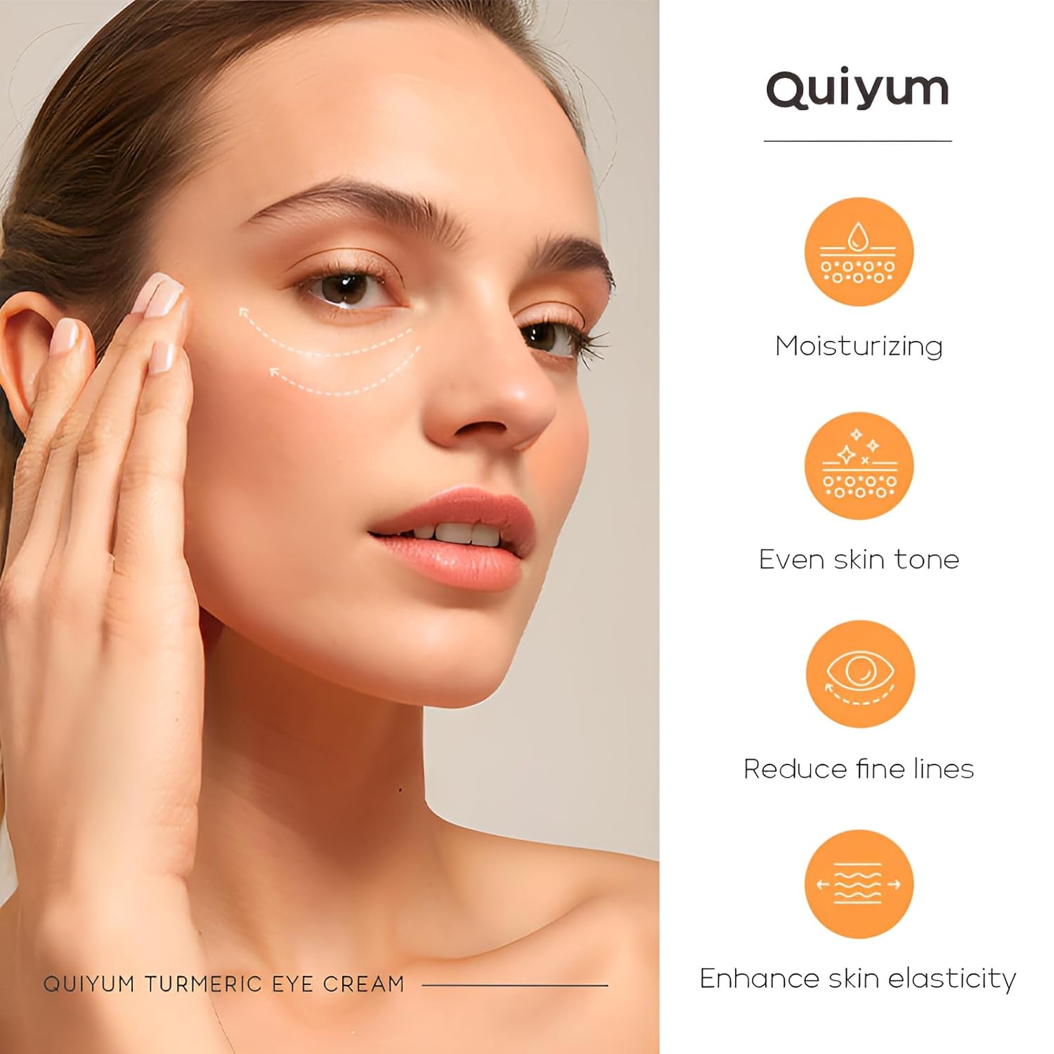 - 【Dark Circle & Puffiness Treatment】Quiyum Turmeric Eye Cream combines vitamin C and natural turmeric powder to brighten the delicate skin around your eyes, reducing dullness and fading dark circles. Quiyum Anti Aging Eye Cream helps delay signs of aging, enriched with vitamin E and plant-derived squalane for deep moisturization, reducing fine lines and enhancing elasticity.