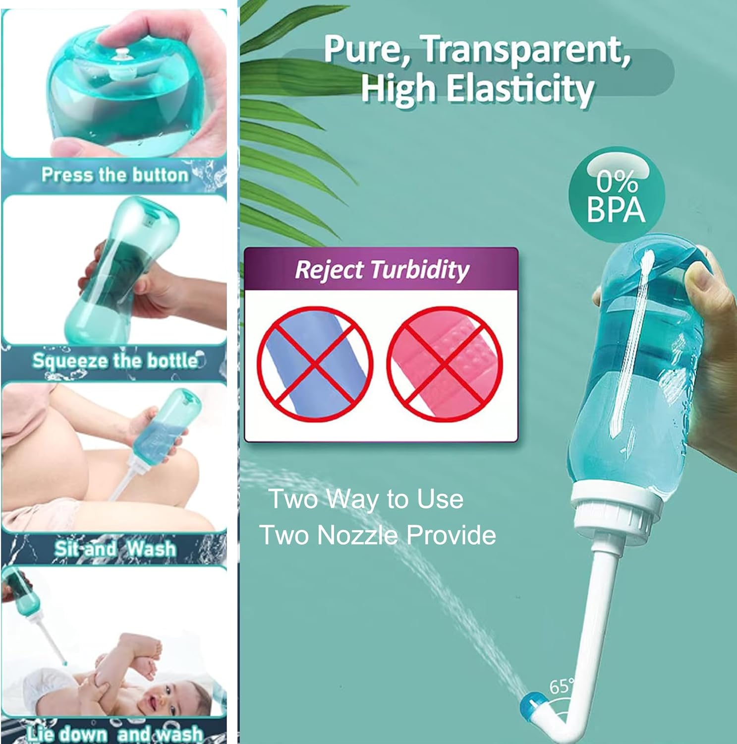 - 2 kinds of nozzles: straight-type nozzle can rinse the baby's anus, and the curved nozzle is used for cleaning the female genital area, it is very effective to clean the area after urinating, it can keep clean and prevent infection.Upside-Down Design & Angled Spout design allows you to ease the most sensitive parts and clean the hard to reach areas.